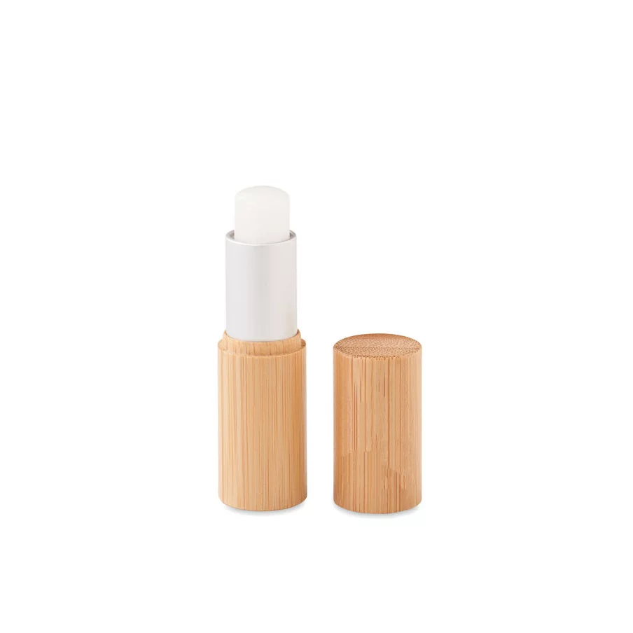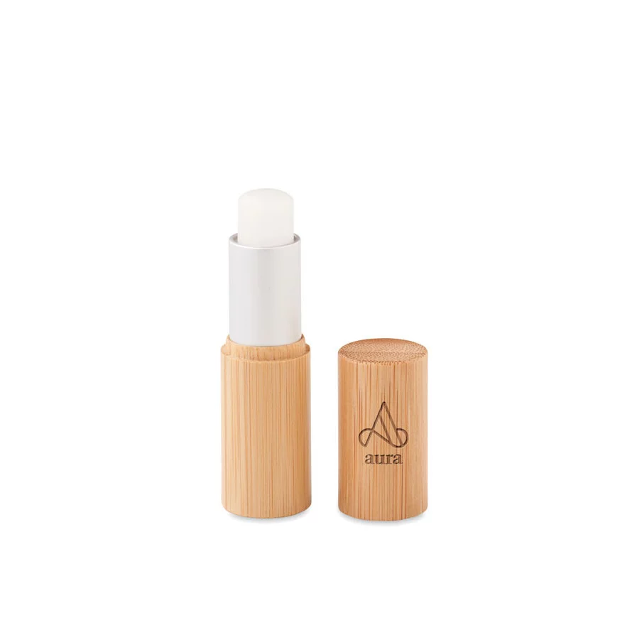 Le baume à lèvres personnalisable Gloss Lux est proposé dans un tube en bambou. Il est SPF 10.