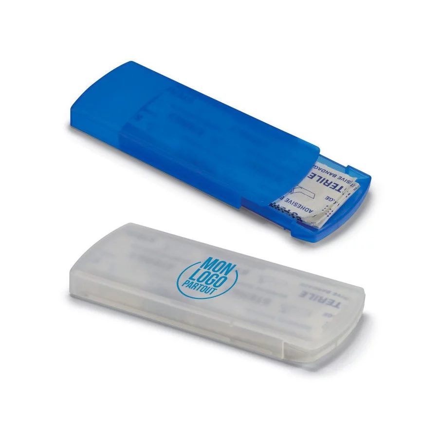 Objet publicitaire pas cher et personnalisable à votre image, découvrez un goodies utile et pratique avec notre boîte composée de 5 pansements. Offrant une zone de marquage intéressante, cette petite boîte en plastique se personnalise pour une diffusion optimale de votre logo ou marque auprès de vos cibles, clients et prospects. Goodies pas cher pour des évènements sportifs par exemple, cette petite boîte de pansements publicitaire est l’objet pub idéal de vos évènements.
