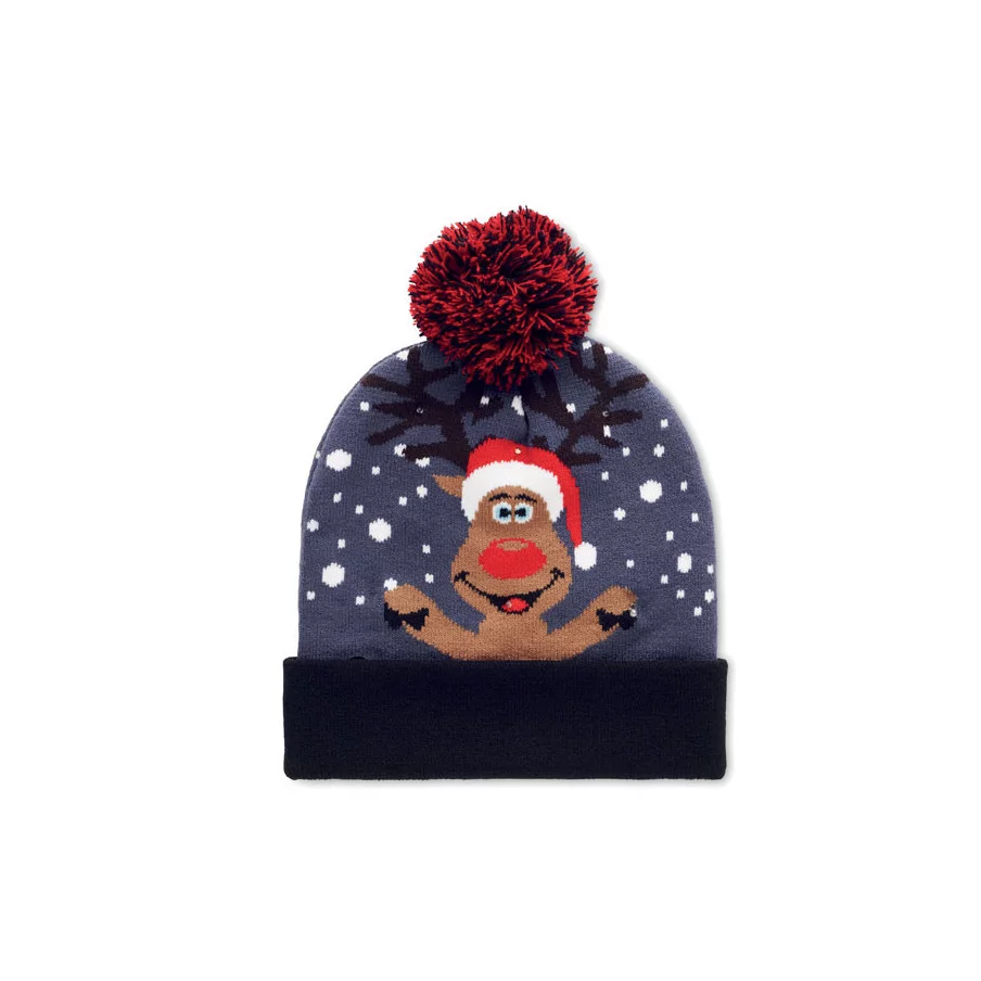 Le bonnet de Noël publicitaire est tricoté en acrylique doux et extensible avec 6 lumières Led avec intensités réglables. 1 pile CR2032 incluse.