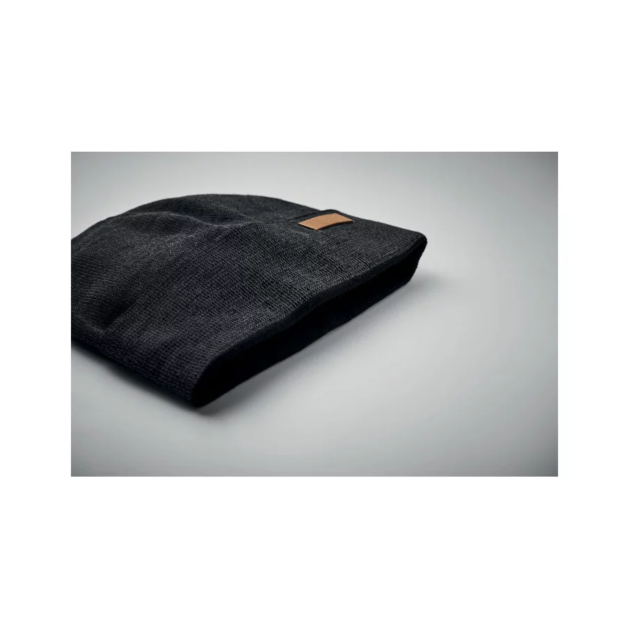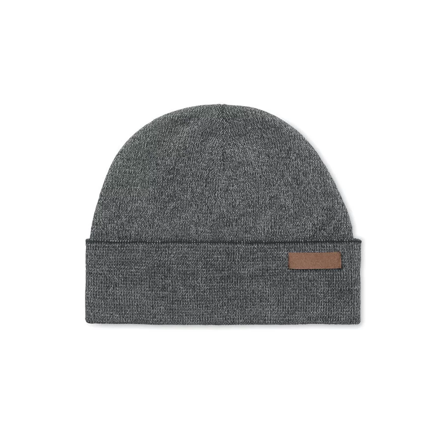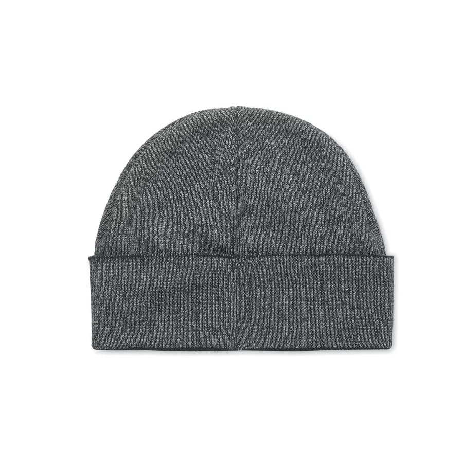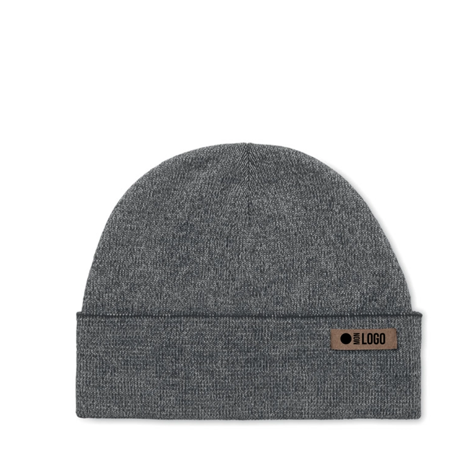 Bonnet publicitaire en acrylique double face avec bande réfléchissante de 30 % et étiquette pour zone de personnalisation. Usage promotionnel uniquement.