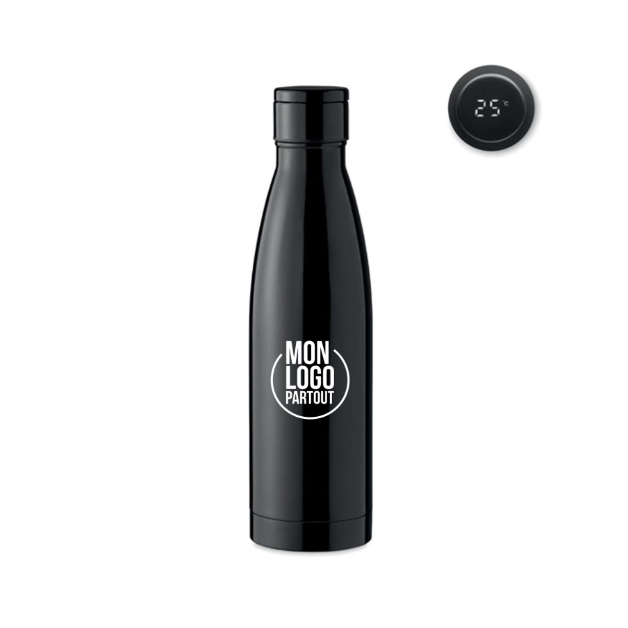 Bouteille personnalisable à vide isolant double paroi en acier inoxydable. Innovante, cette bouteille est dotéd d'un thermomètre tactile à LED incorporé dans le couvercle. Pile CR 2032 rechargeable incluse / Anti fuite.