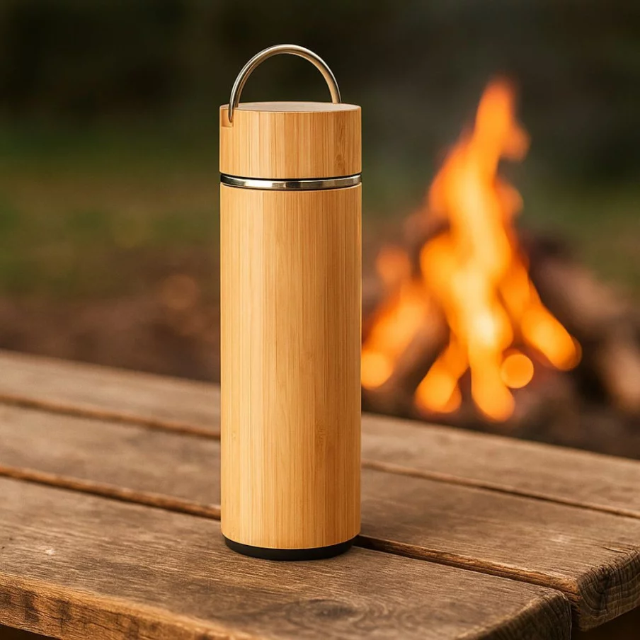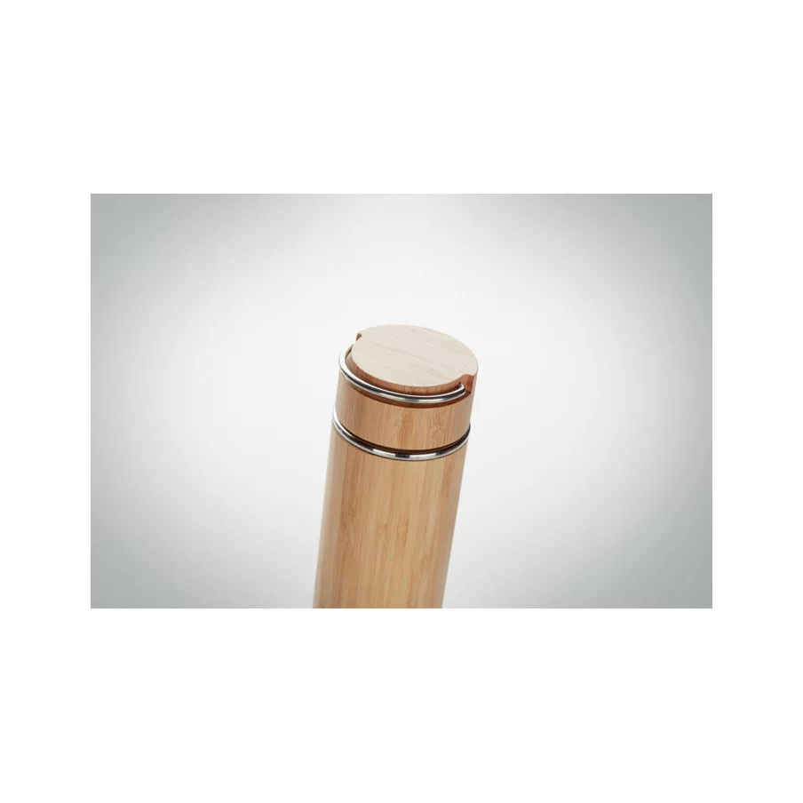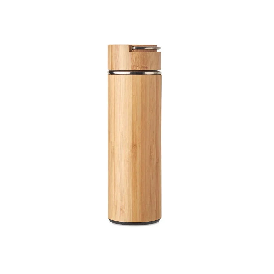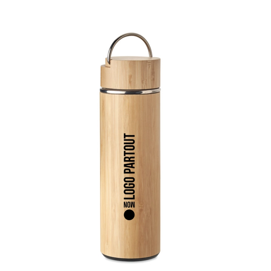 Cette bouteille publicitaire dispose de nombreux atouts. Elle a notamment une double paroi pour retenir le froid ou la chaleur mais également un infuseur à thé. Son aspect en bambou fait d'elle un objet publicitaire écologique.