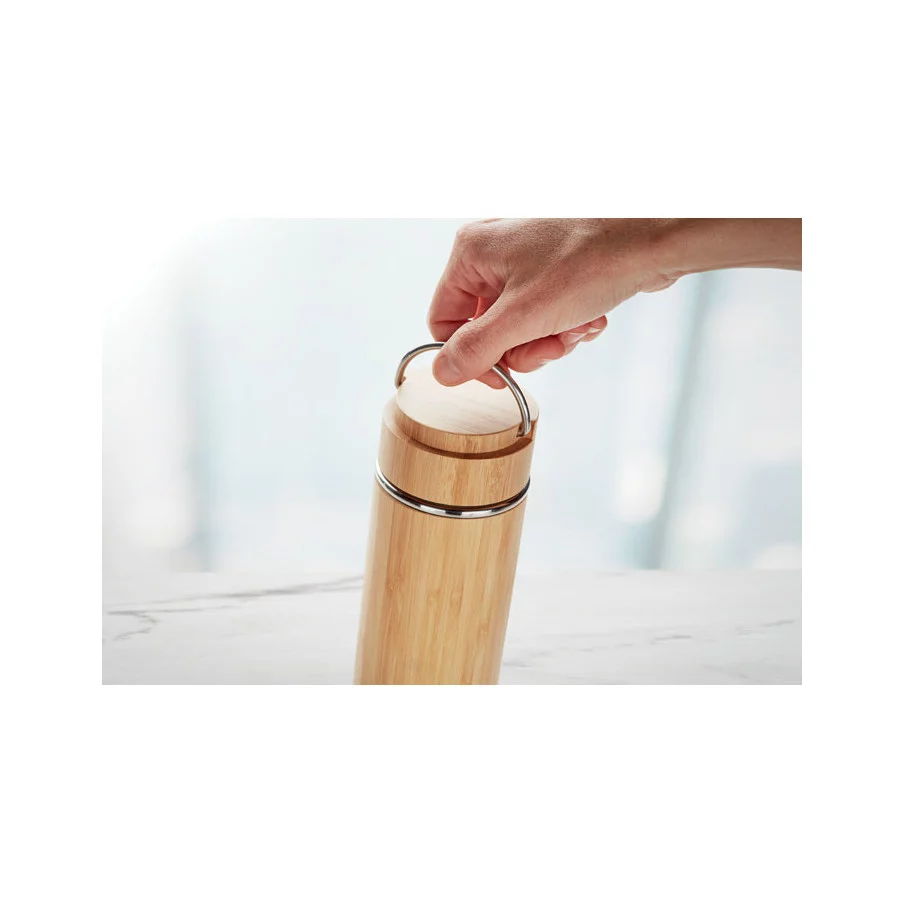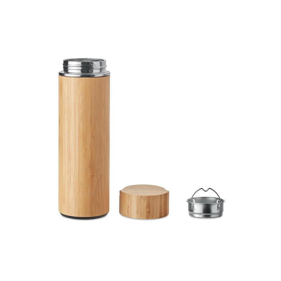 La boîte à objets vous propose ici une sublime bouteille à isolation par le vide, double paroi en acier inoxydable et bambou. Proposée avec un infuseur à thé à l'intérieur, cette bouteille promotionnelle vous sera d’une grande utilité.
