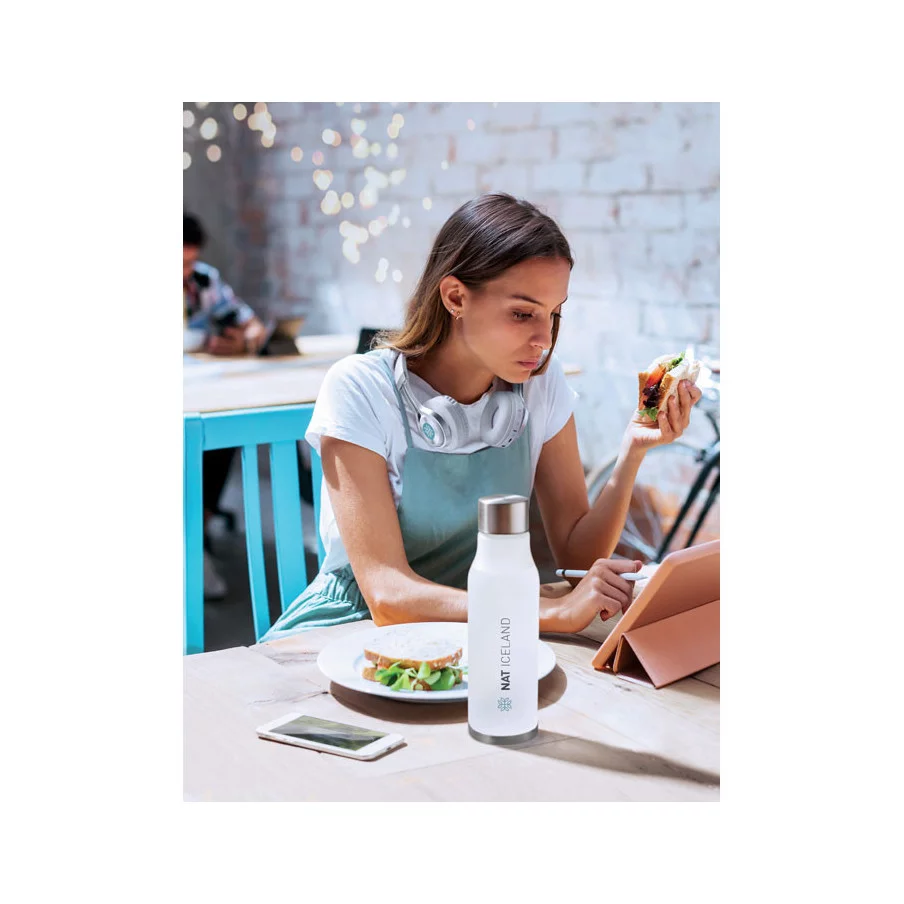Véritable support promotionnel, la bouteille s'est installée dans le quotidien des entreprises, administrations et CSE. Pratique au quotidien, elle permet une visibilité unique de votre logo sur votre bureau. Fabriquée à base de plastique recyclé (RPET), cette bouteille originale est dotée d'une finition soft touch et d'un bouchon en acier inoxydable.