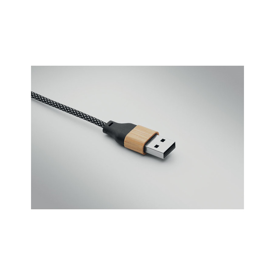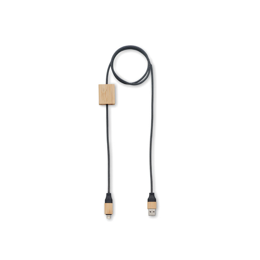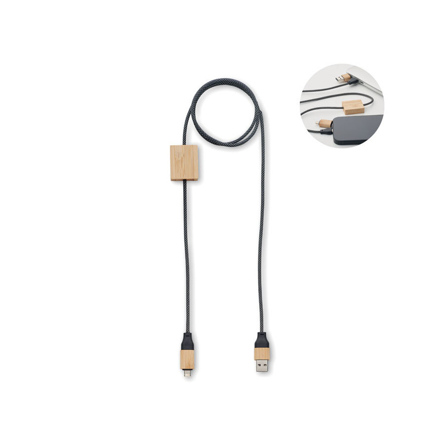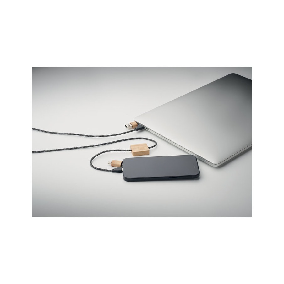 Ce câble de charge est fabriqué en RPET avec des détails en bambou. Il offre une charge rapide 60W avec entrée 2-en-1 (Type-C & Type-A) et sortie Type-C & 2-en-1 broche.