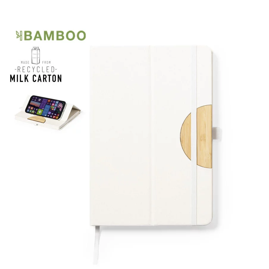 Craquez pour notre carnet de notes promotionnel fabriqqué à partir de brique de lait recyclée. Transformable en support smartphone, ce carnet à couverture rigide est dotée d'une fermeture élastique avec marque page et porte stylo. Par son haut degré de recyclabilité, il répondra à vos attentes. Comprend 100 Feuilles lignées.