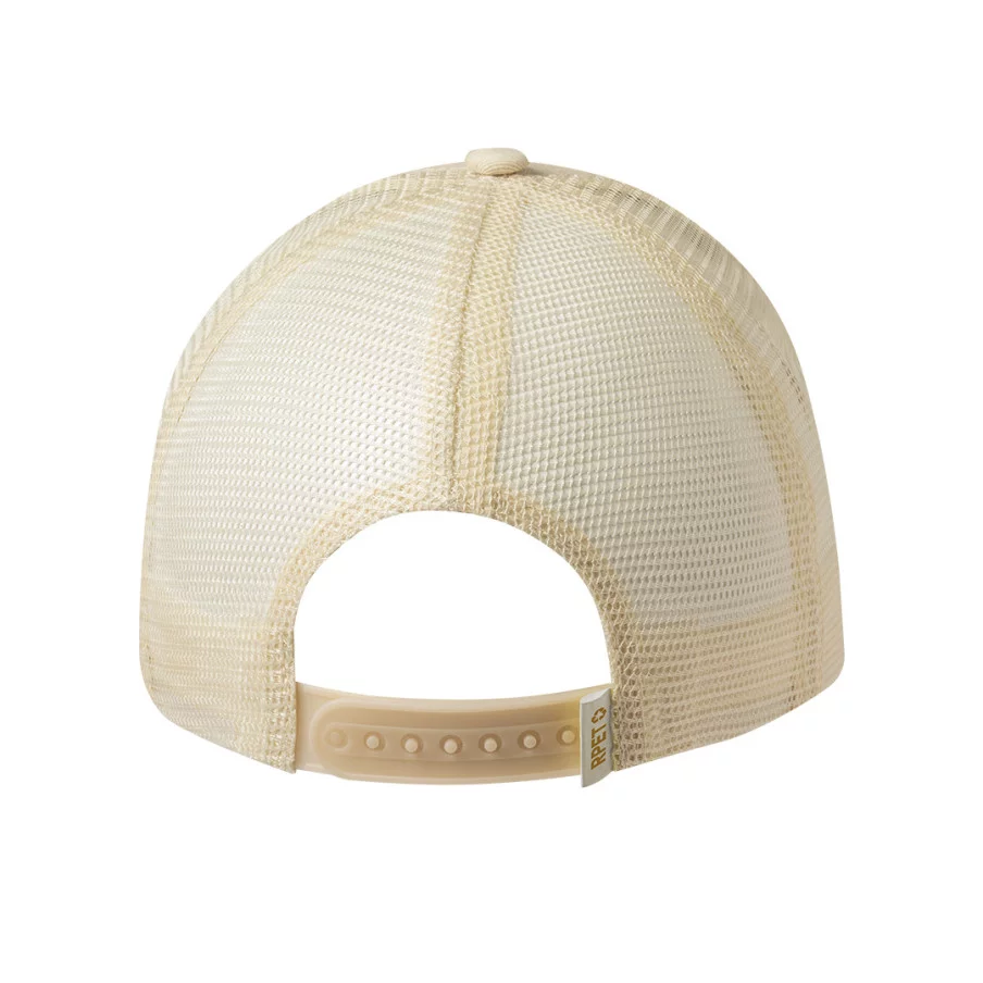 Cette casquette est composée de 5 panneaux et a un style trucker. Elle a été conçue avec du polyester RPET durable, et possède une visière cousue et une partie arrière en maille. De plus, elle a une fermeture réglable en plastique assortie de couleur naturelle et une étiquette distinctive de RPET.