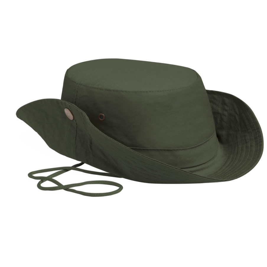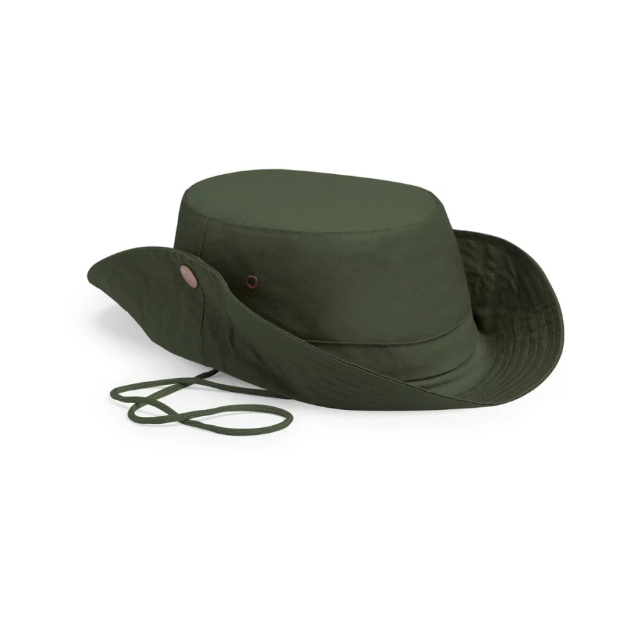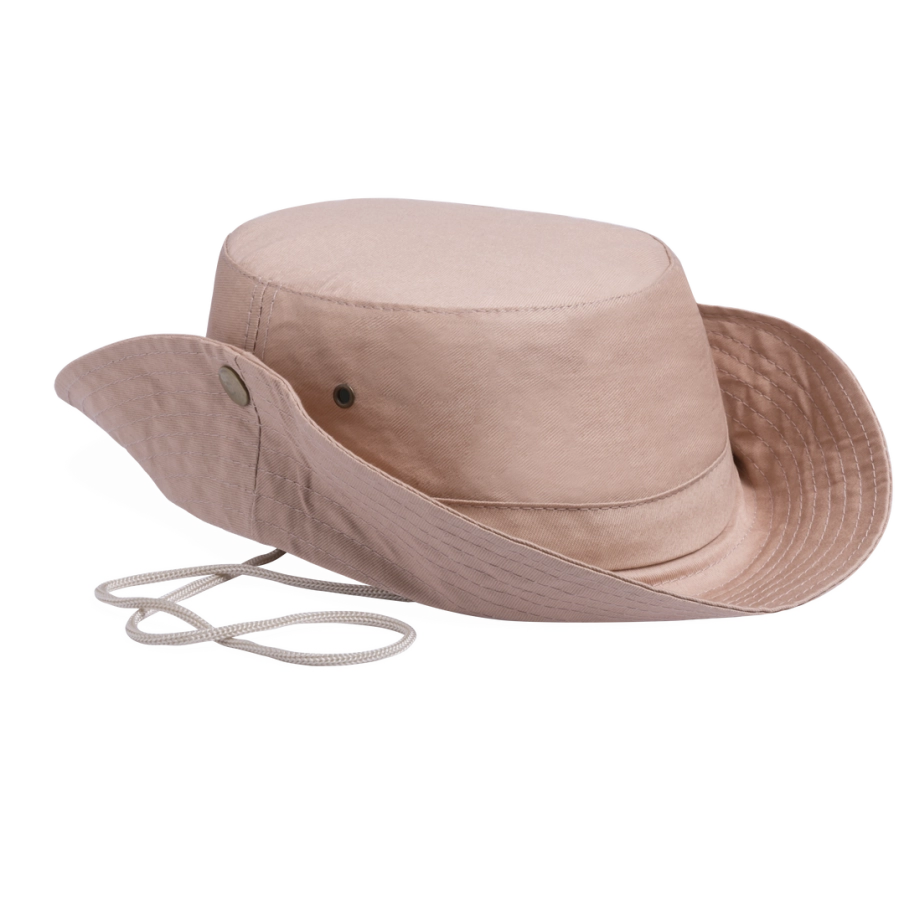 Chapeau publicitaire de type safari en coton. Confortable avec ses espaces de ventilation latéraux renforcés par des œillets métalliques, ce chapeau promotionnel est intemporel.