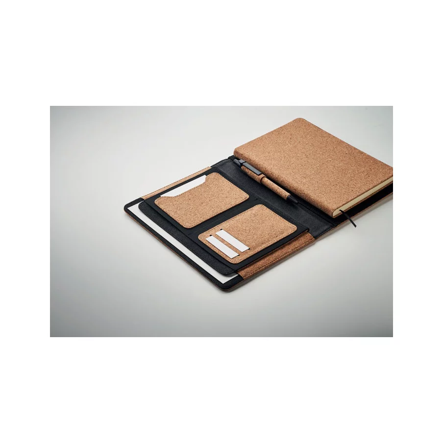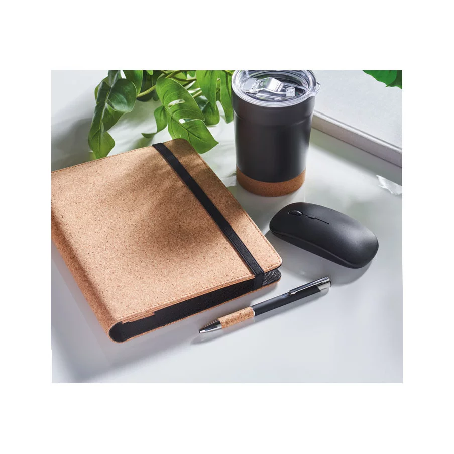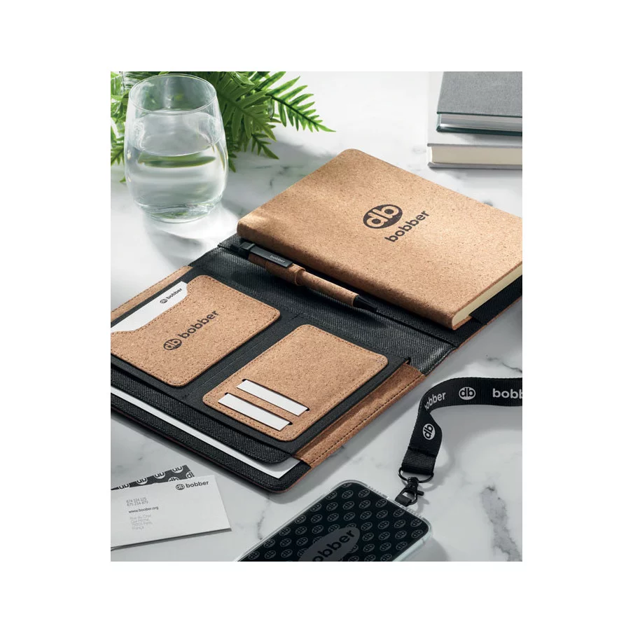 Le conférencier A5 en liège de laboiteaobjets.com : un accessoire élégant et écologique avec carnet amovible, stylo assorti et de nombreuses fonctionnalités.