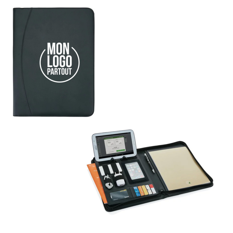 Ce conférencier A4 en PU comporte plusieurs fonctionnalités : fermeture à zip, support pour tablette et téléphone avec fenêtre transparente, brides élastiques, 5 portes cartes et 1 pochette de classement expansible. Il est accompagné d'un bloc-notes de 20 feuilles et est compatible avec toutes les tablettes.