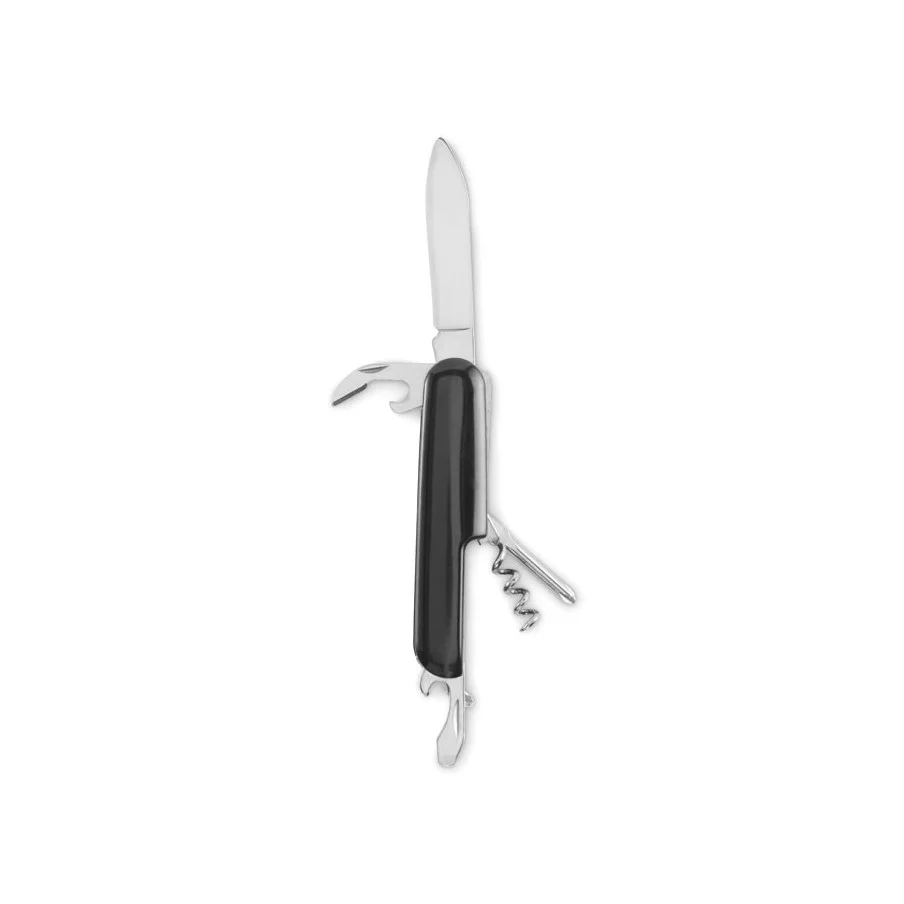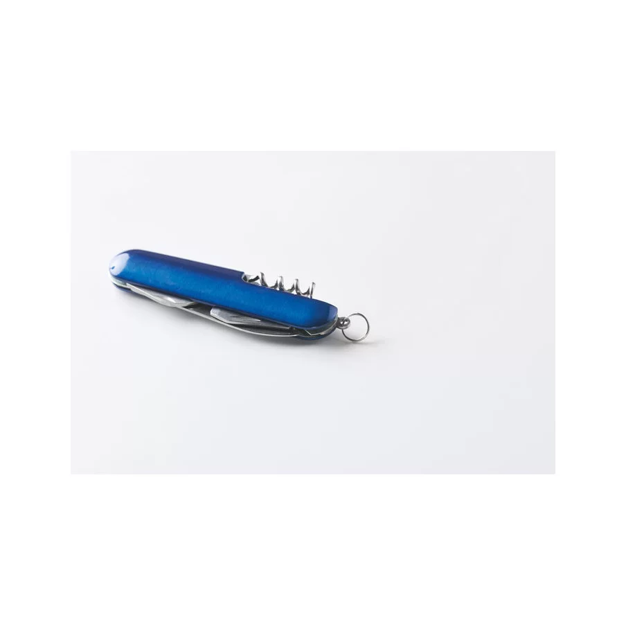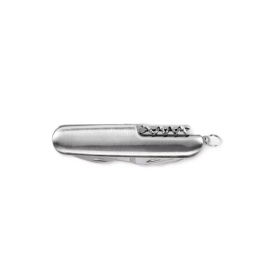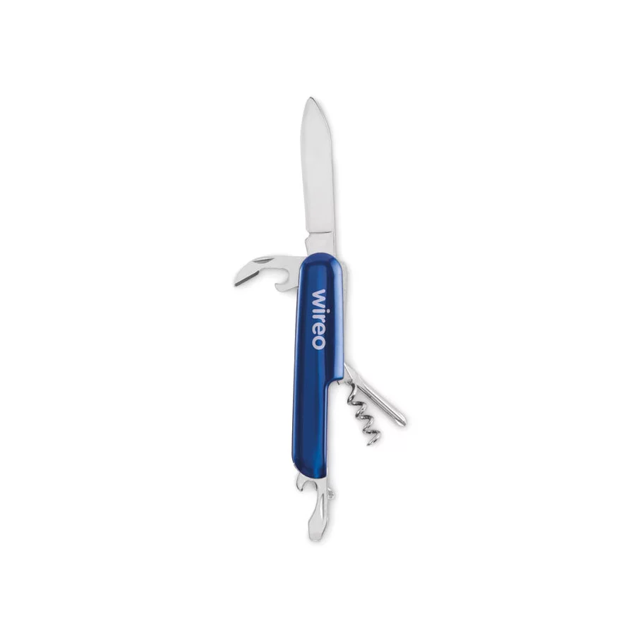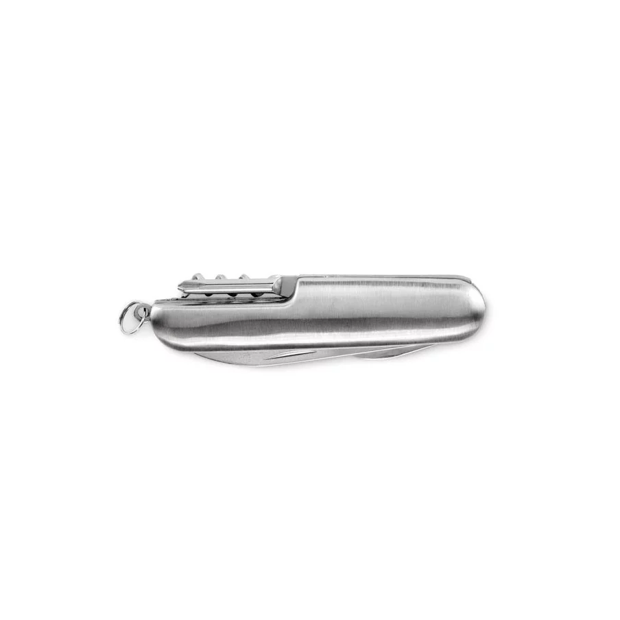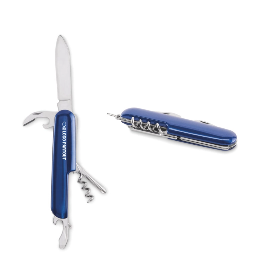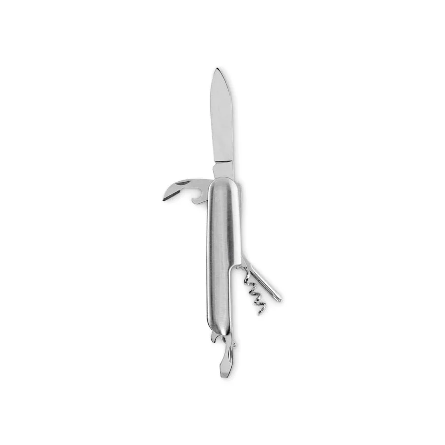 Ce couteau de poche est fabriqué en aluminium recyclé. Il offre 5 fonctions : lame, décapsuleur, tournevis, tire-bouchon et ouvre-boîte. Un article pratique et personnalisable.