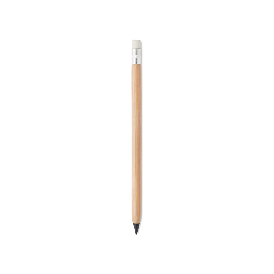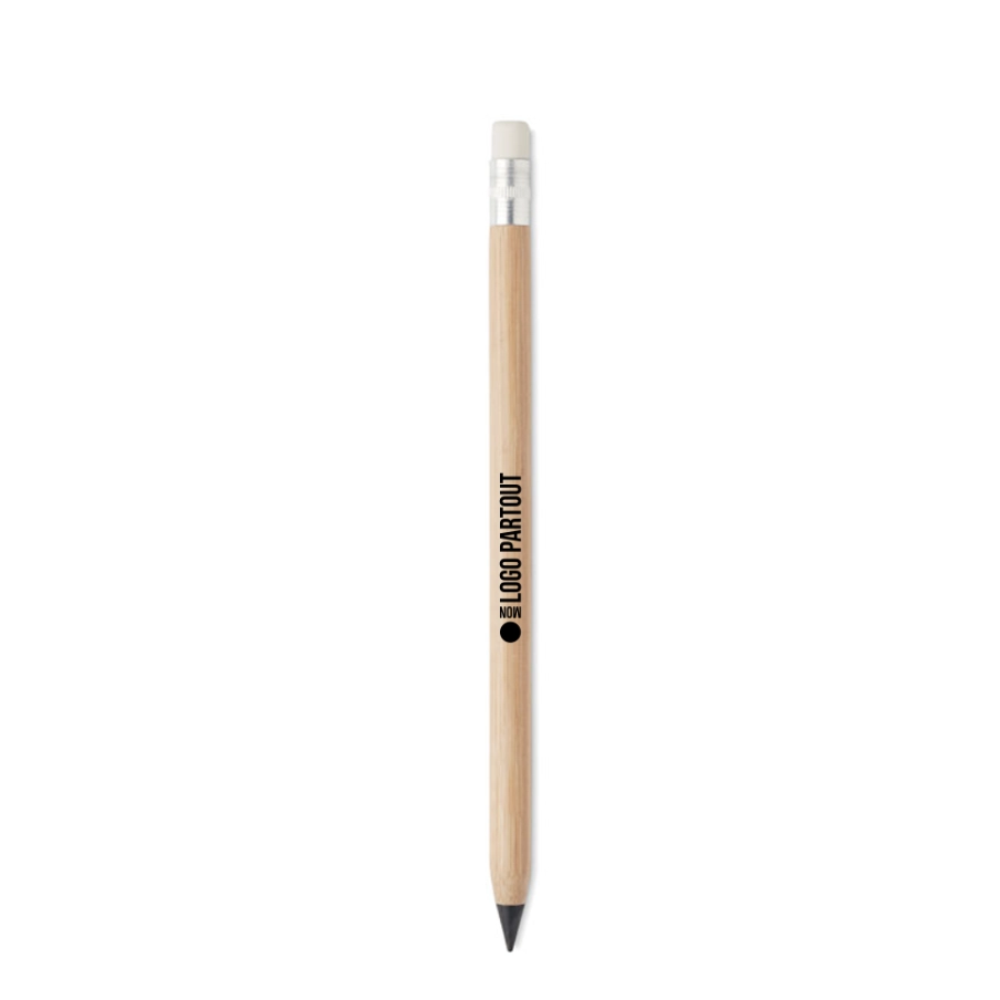 Cadeau publicitaire original, offrez à vos clients un crayon avec une durée de vie très élevée. Ce crayon promotionnel sans encre longue durée en bambou dispose d'un corps en bambou et d'une gomme sur le dessus avec capuchon en papier. Ce crayons est doté d'une pointe en alliage métallique à durée de vie illimitée.