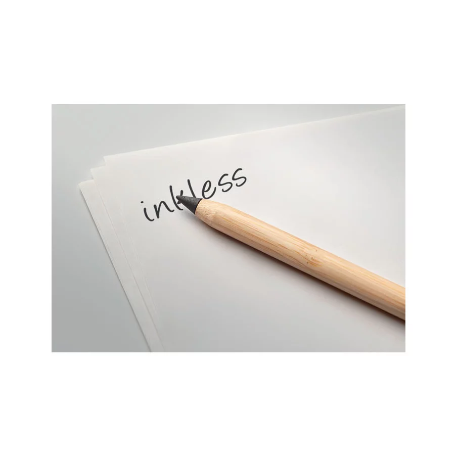 Le crayon personnalisable Inkless plus est un modèle fonctionnant sans encre. Le crayon publicitaire écrit avec sa pointe en alliage métallique. Il est fait en bambou.
