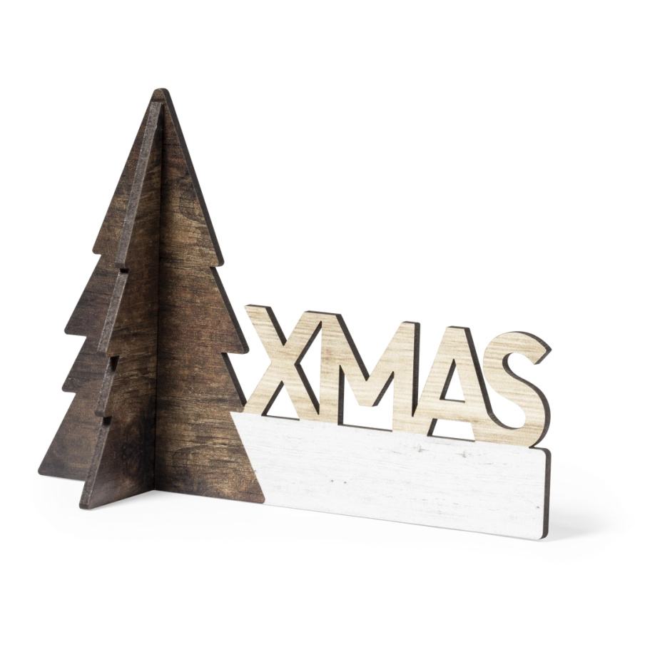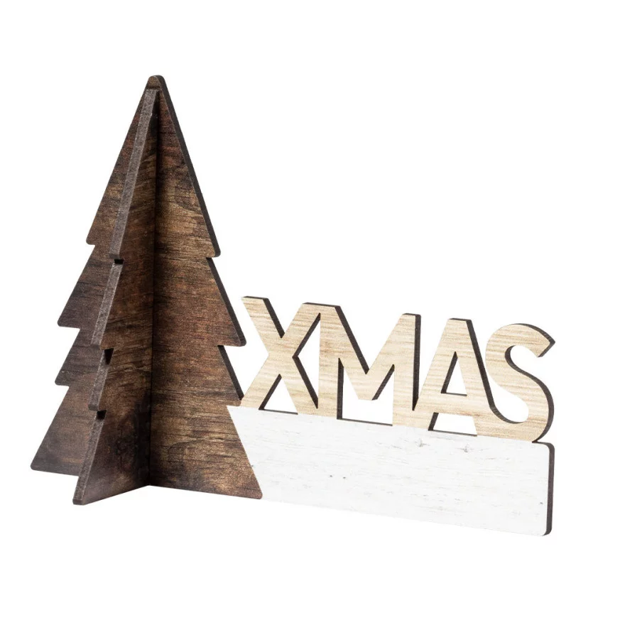 Cette décoration de Noël en bois naturel au motif de sapin intègre le texte découpé XMAS avec une finition bicolore. Fabriquée en Europe, elle offre une large surface de marquage.