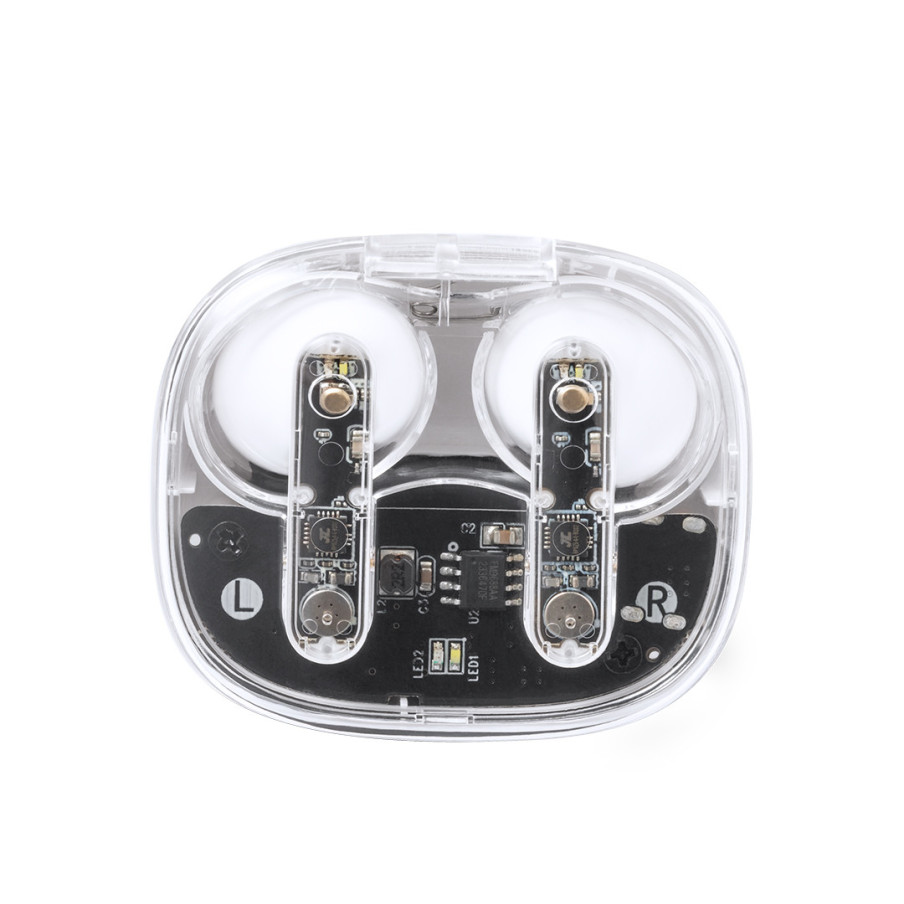 Optez pour des écouteurs Bluetooth® au design transparent personnalisés, avec une base de charge, dans une boîte kraft.