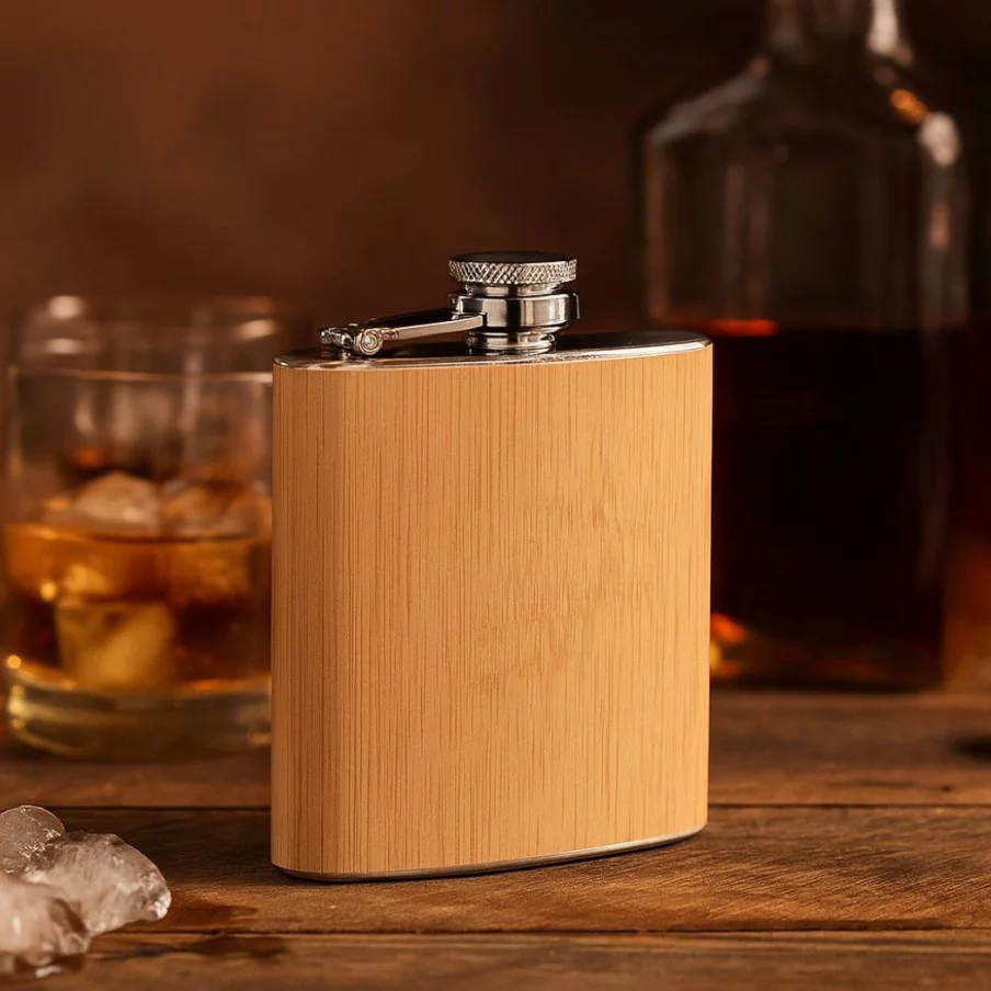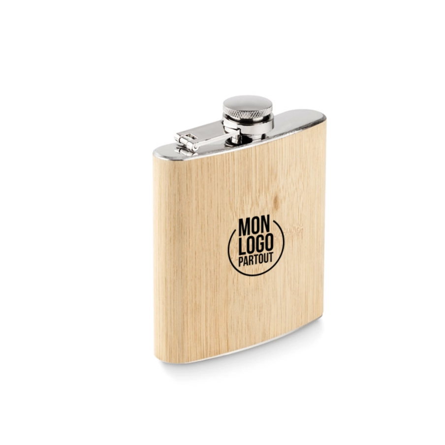 La flasque publicitaire Hiphip est fabriquée en acier et habillée de bambou. Elle dispose d'une capacité de 175 ml.