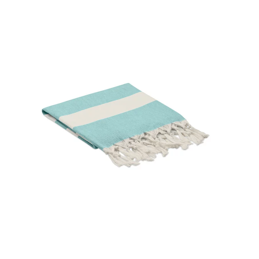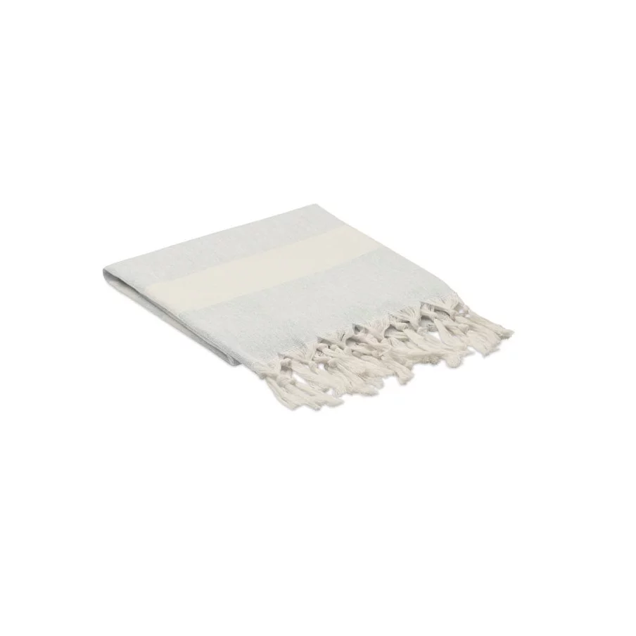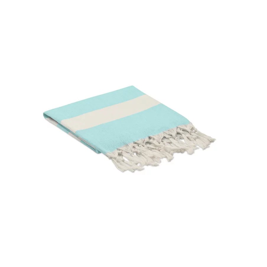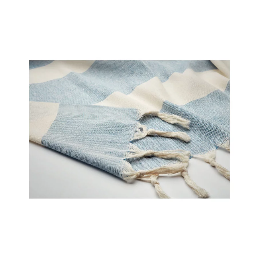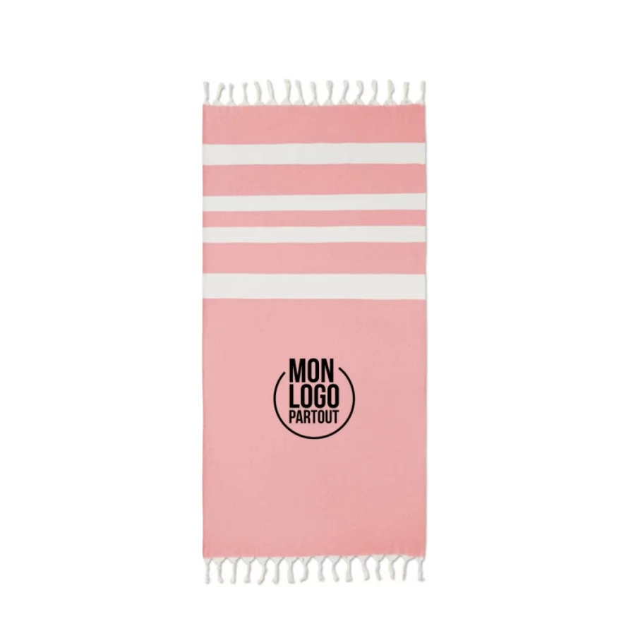 La fouta personnalisée de plage publicitaire Agoura est fabriquée en tissus recyclés.