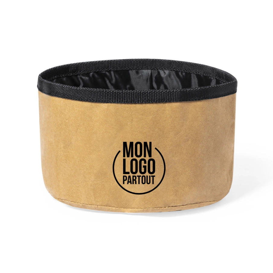 Accessoire pour chien publicitaire, découvrez sans plus attendre nottre bol pliable d'une capacité de 1,3l. L'extérieur est en papier recyclé laminé (270g/m2), l'intérieur en RPET.