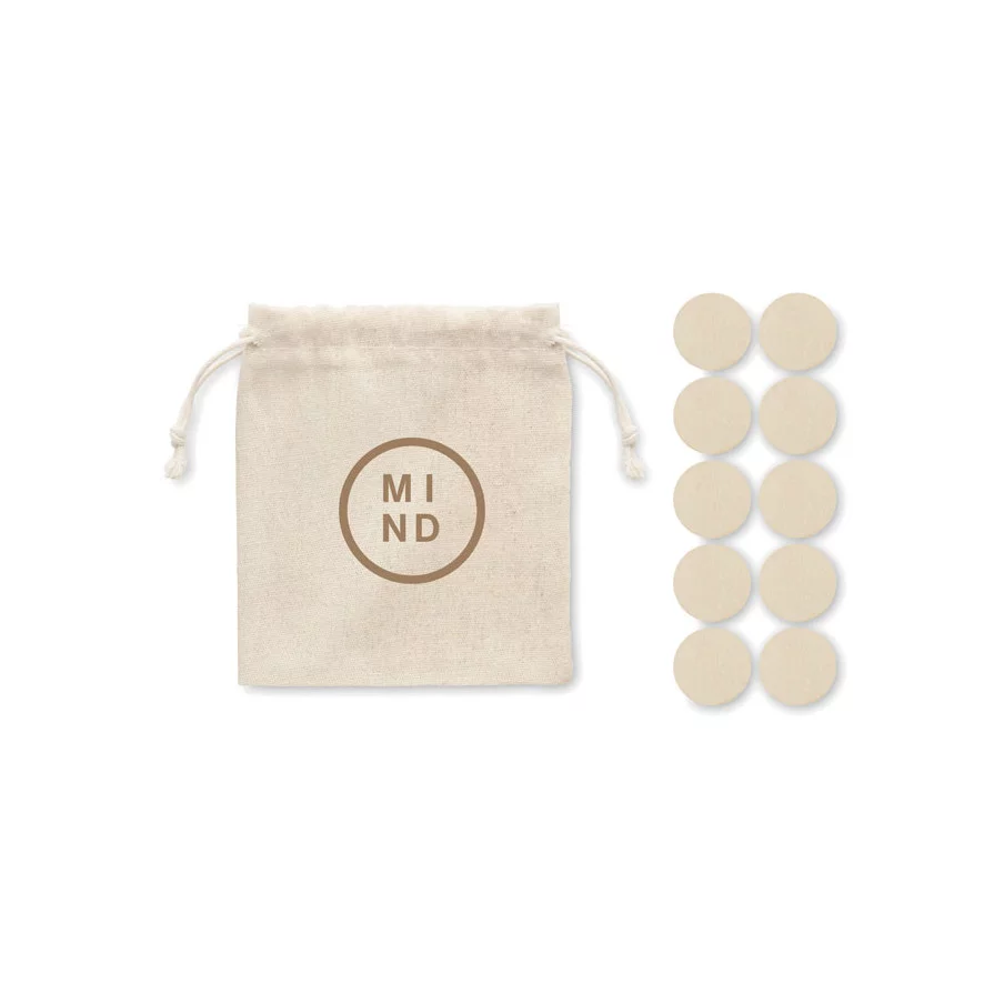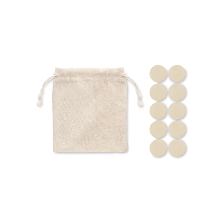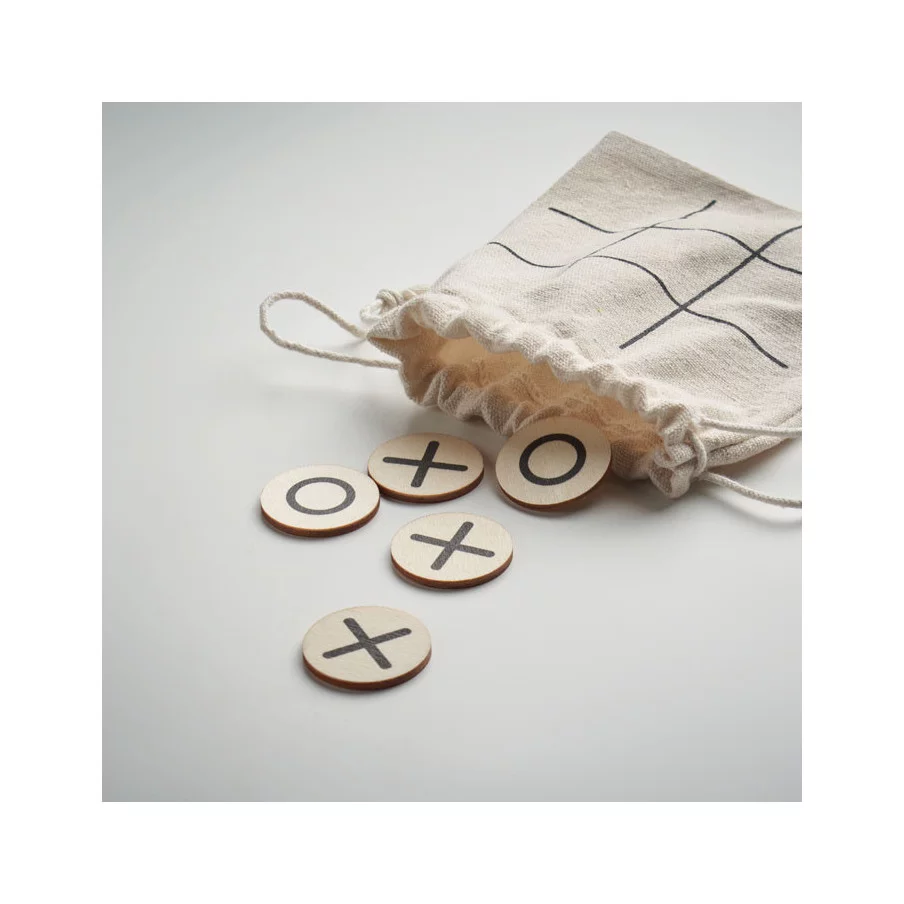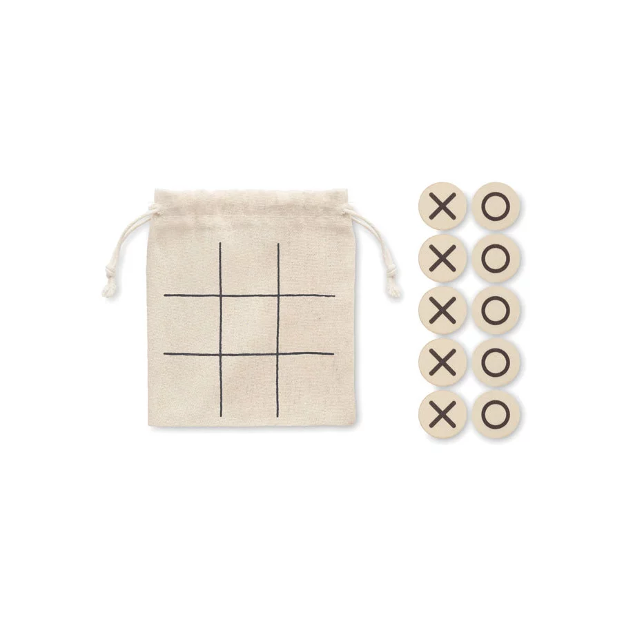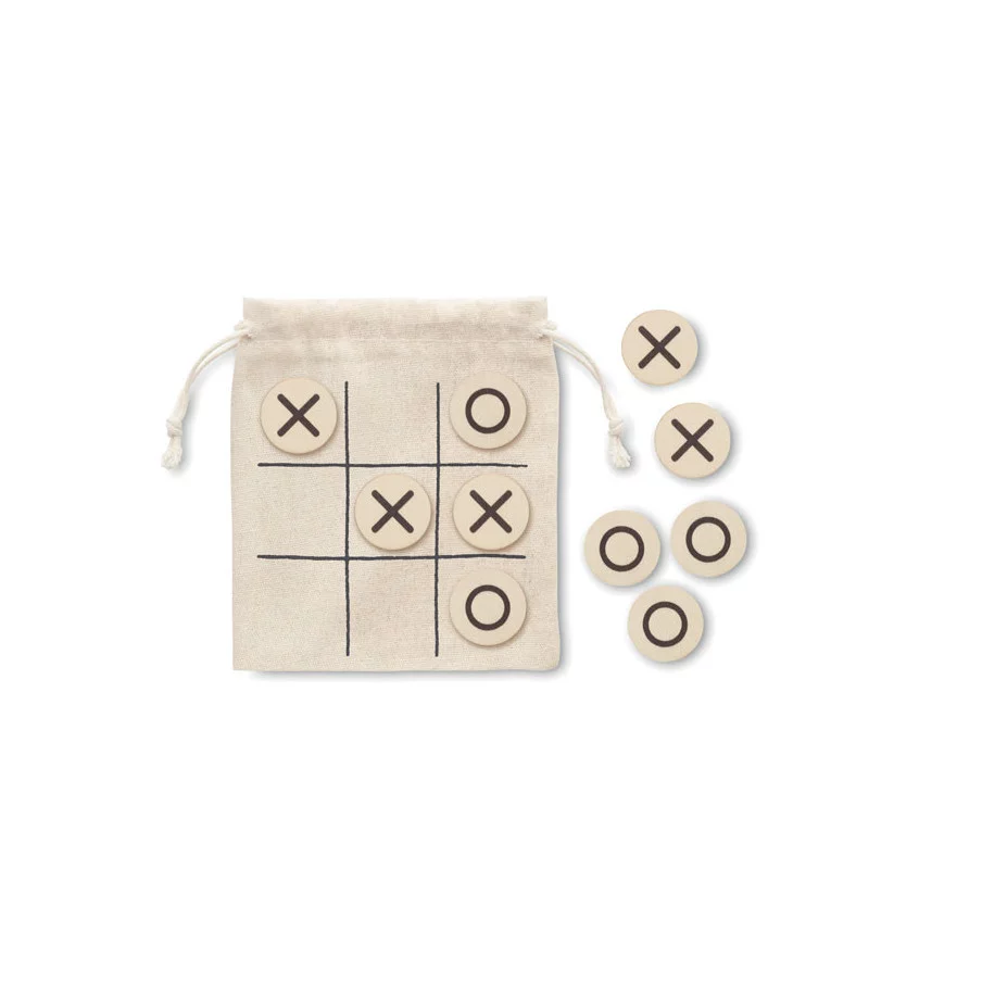 Le jeu de morpion publicitaire Topos contient 10 jetons en bois. Ils sont livrés dans un bel étui en coton qui sert de terrain de jeu.