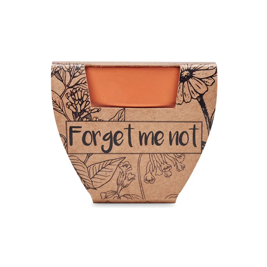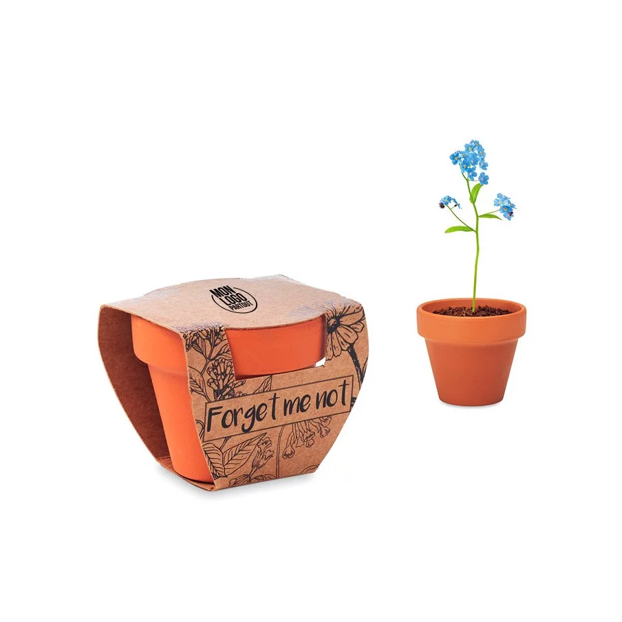 Offrez à vos clients un goodies écologique avec notre kit de plantation composé d’un mini pot en terre cuite personnalisé contenant des graines de Mysotis.