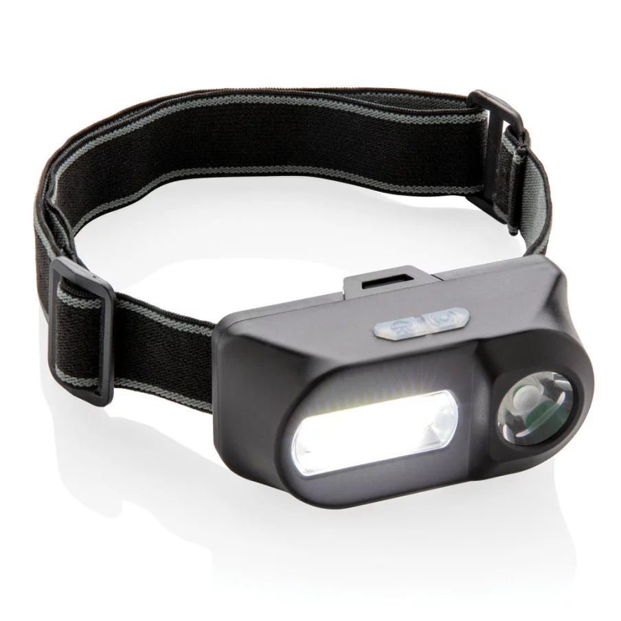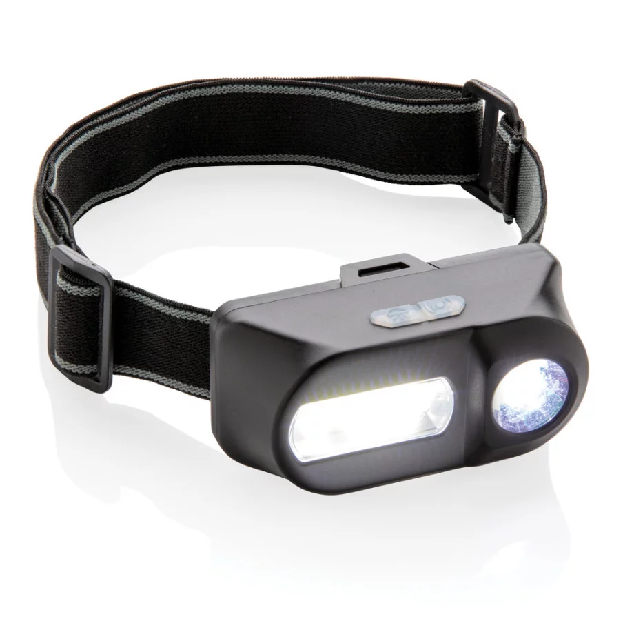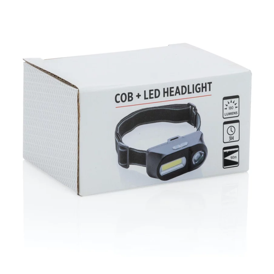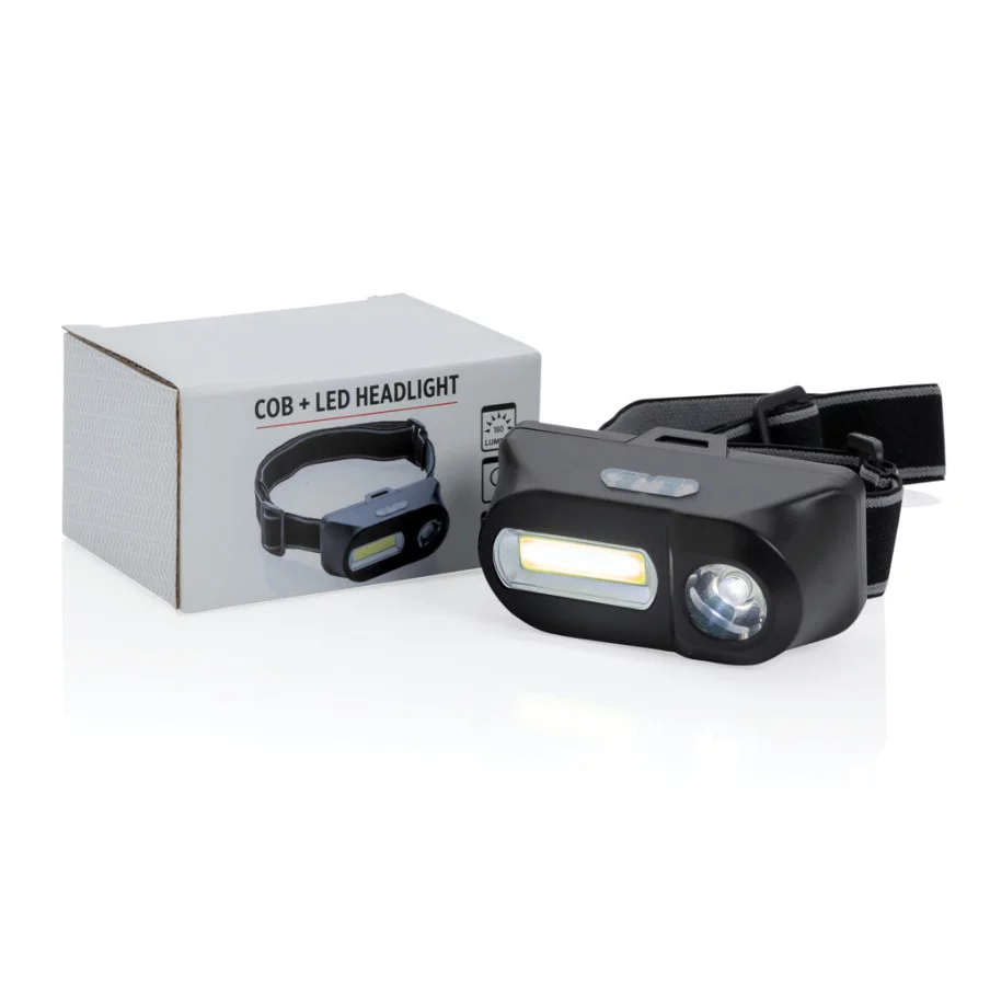 Cette lampe frontale en ABS à double tête offre un éclairage puissant et polyvalent grâce à ses deux lampes : une lumière COB de 180 lumens pour éclairer une zone proche et une lumière LED de 90 lumens pour éclairer les zones plus éloignées jusqu'à 80 mètres. Ces deux lampes peuvent être réglées selon trois modes d'intensité : brillant, faible et clignotant, s'adaptant ainsi à tous les besoins et toutes les situations.Lampe frontale publicitaire : confort optimal