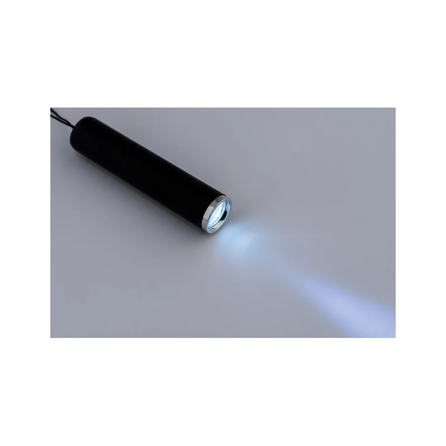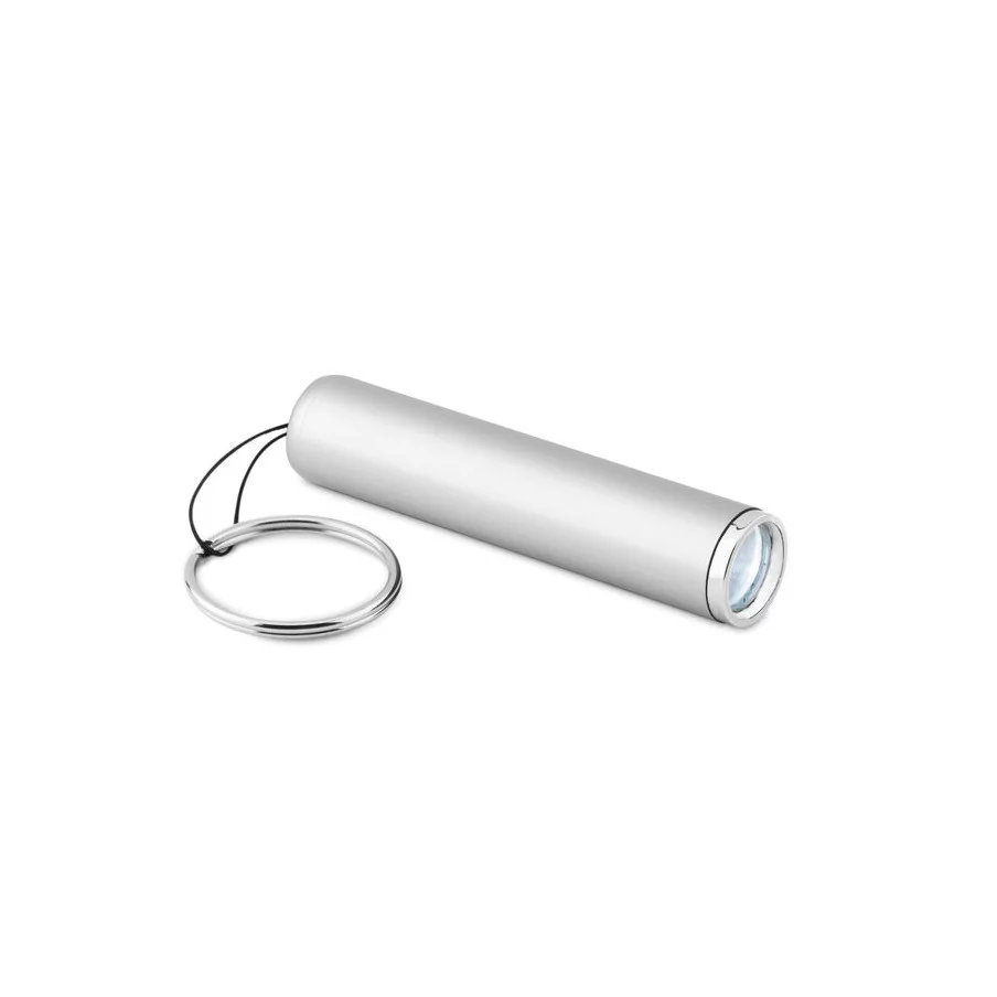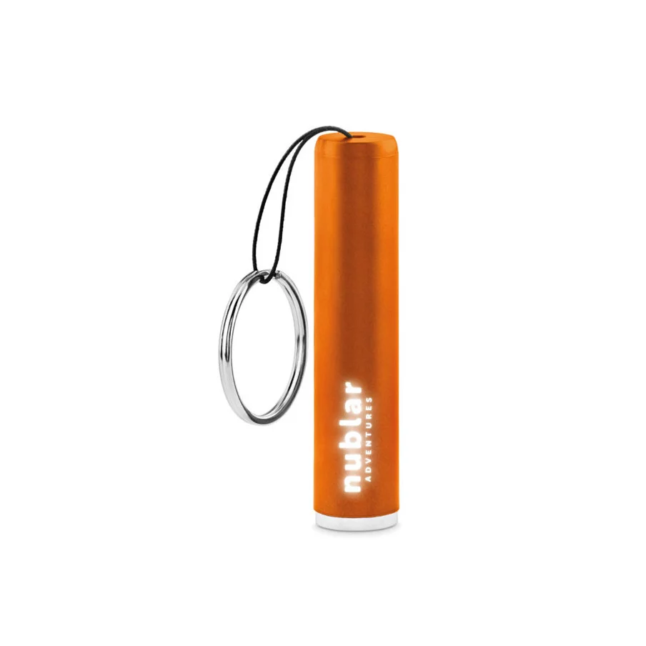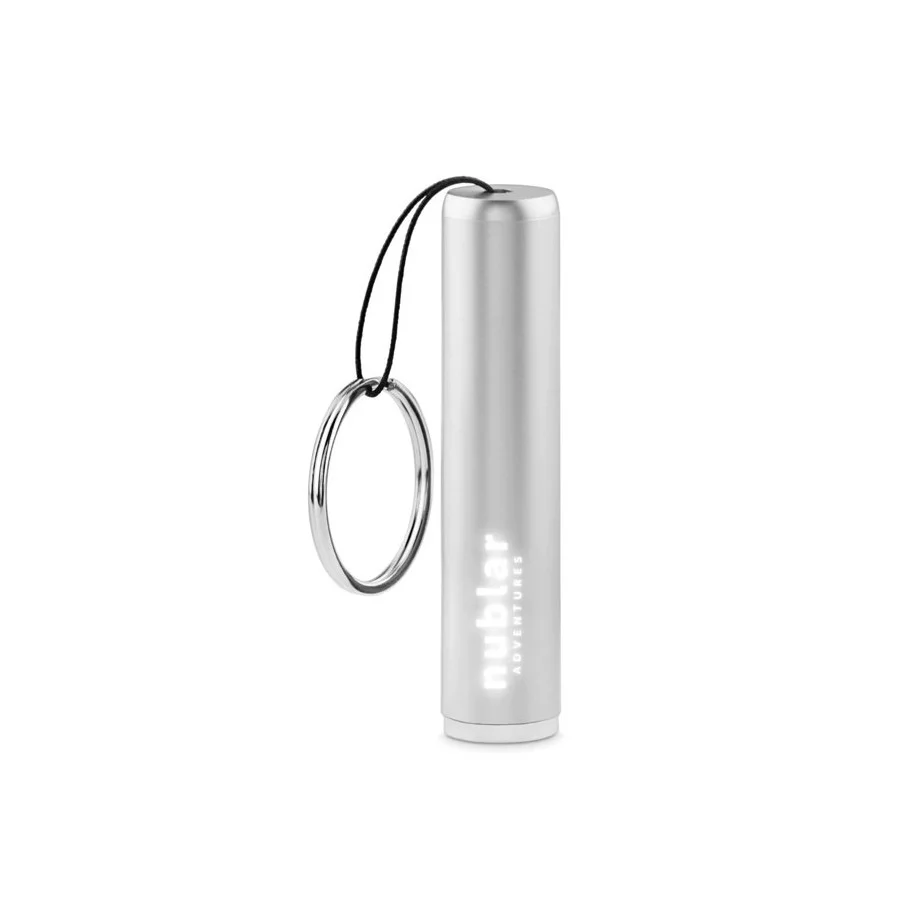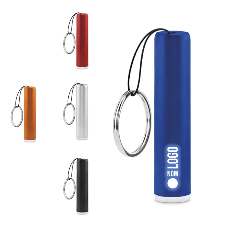 Lampe torche publicitaire avec ampoule LED en ABS et porte-clés. (3 piles AG3 incluses). Pour un logo illuminé, choisissez la gravure laser comme technique de marquage !