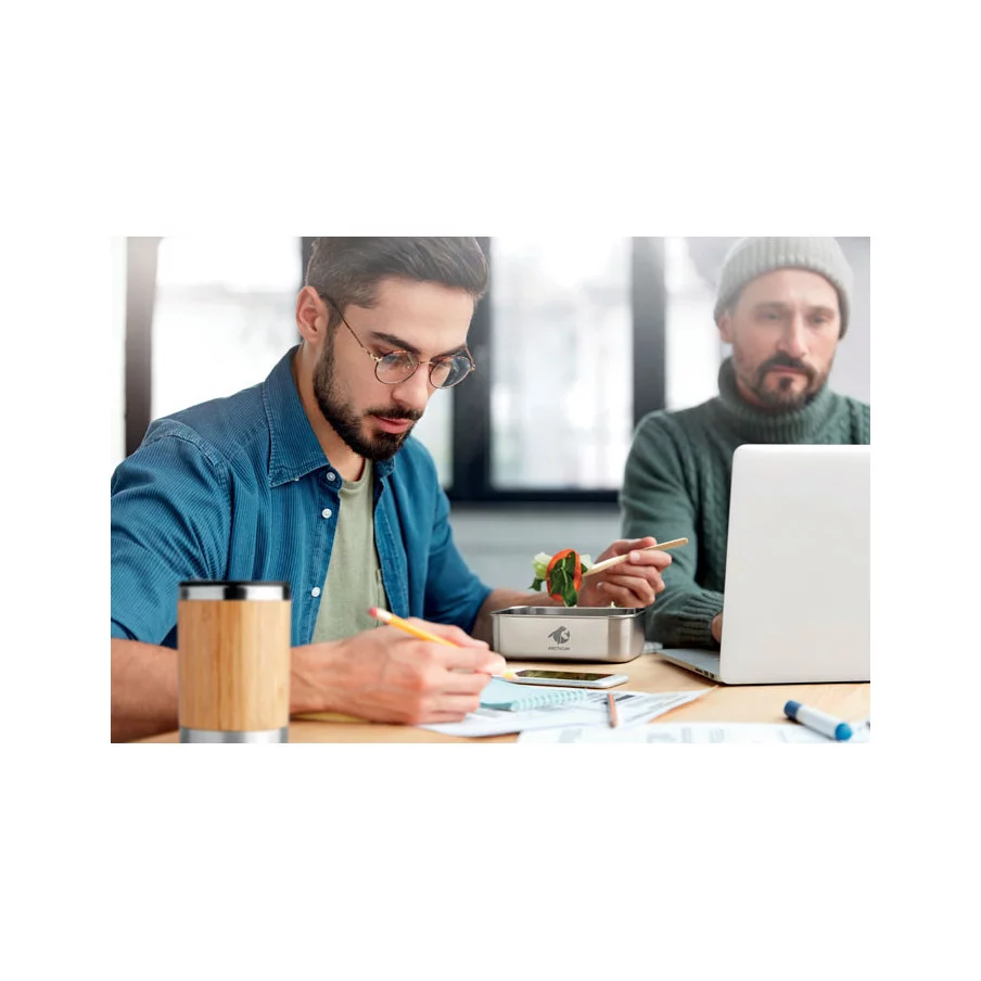 Lunch box personnalisable en inox avec couverts en bambou inclus.