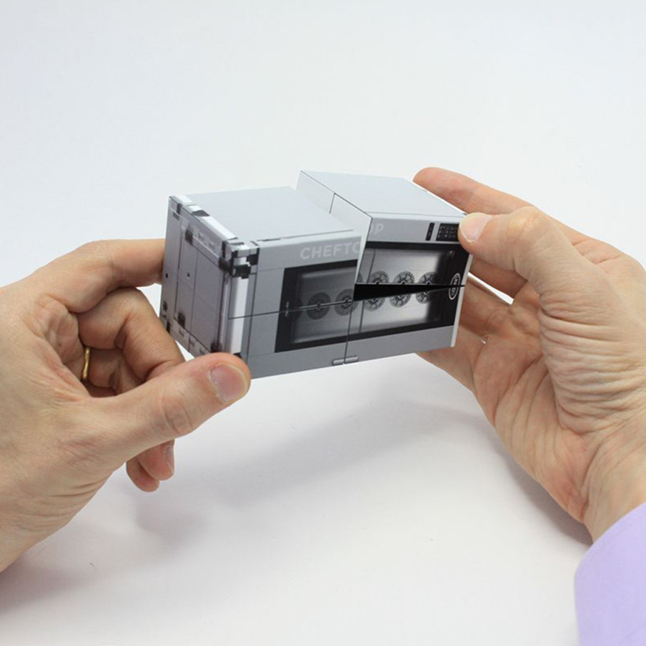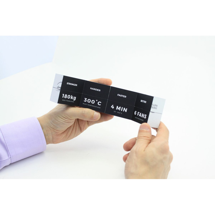 Ce Magic cube est un support polyvalent qui se plie et se déplie à volonté avec une image qui suit une autre image dans une boucle infinie. Ce modèle se présente dans une forme de container personnalisable à 100%.