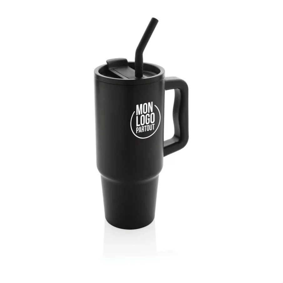 Ce mug en acier inoxydable recyclé de 900ml est doté d'un couvercle anti-déversement, d'une paille et d'un embout en silicone, convenant pour boissons chaudes et froides. Sa double fonction de couvercle à vis lui permet d'être utilisé avec un bec verseur ou une paille.