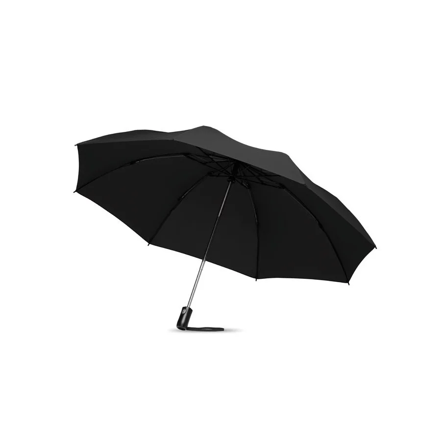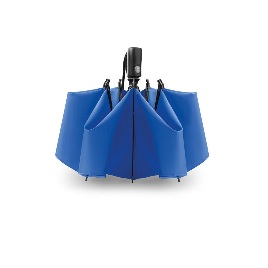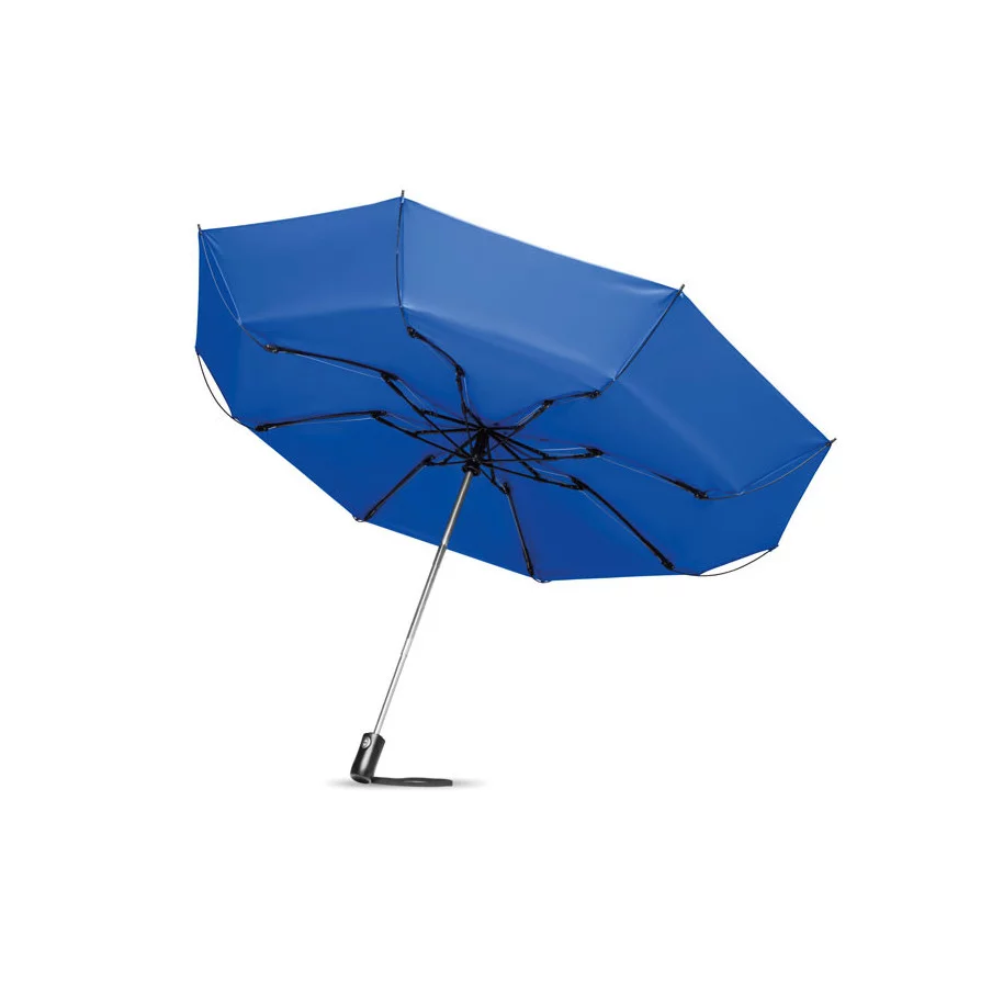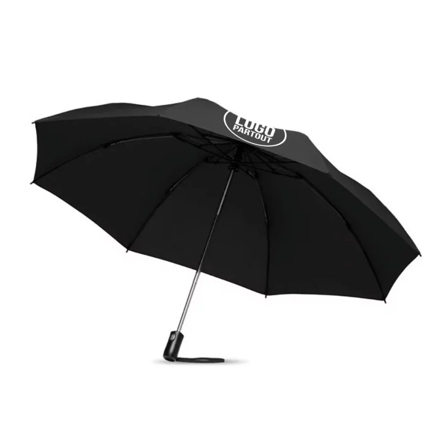 Le parapluie publicitaire à ouverture réversible est présenté dans sa version pliante. Il dispose d'une ouverture et d'une fermeture automatique. Son mât est fabriqué en acier chromé et les baleines sont en fibre de verre. Le parapluie fait 23''.