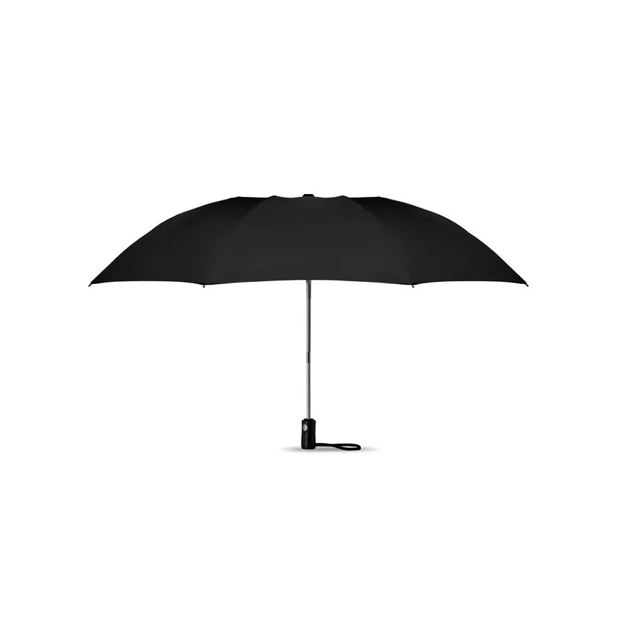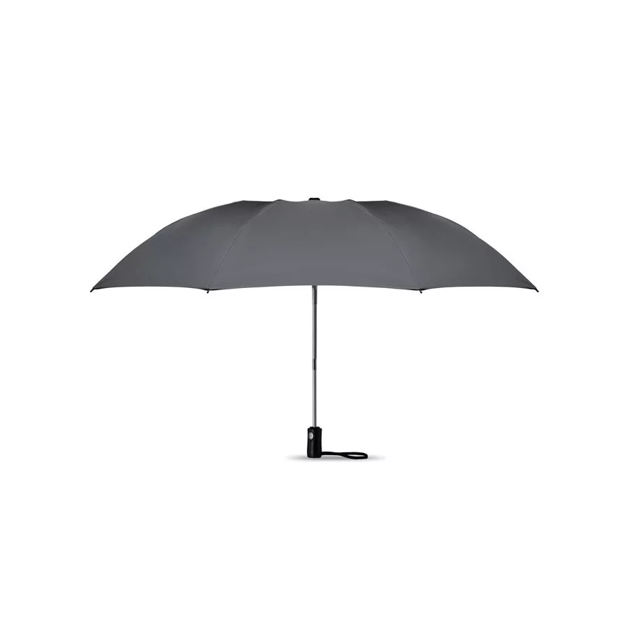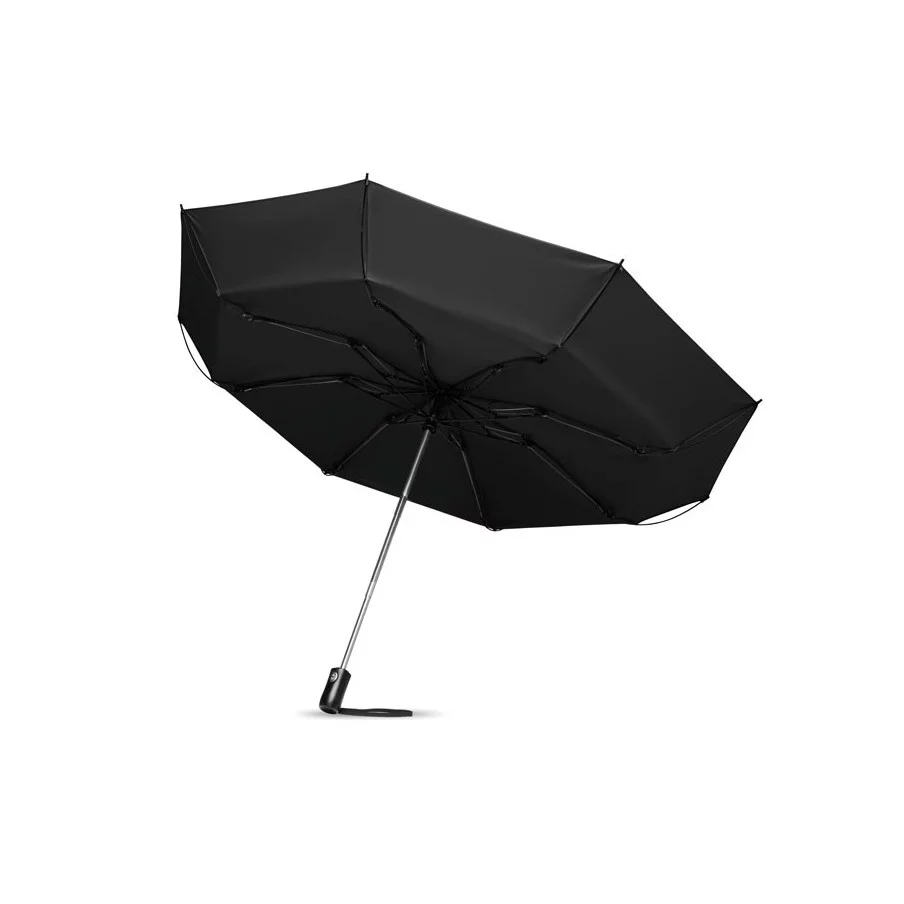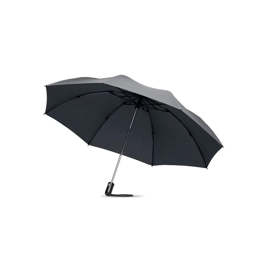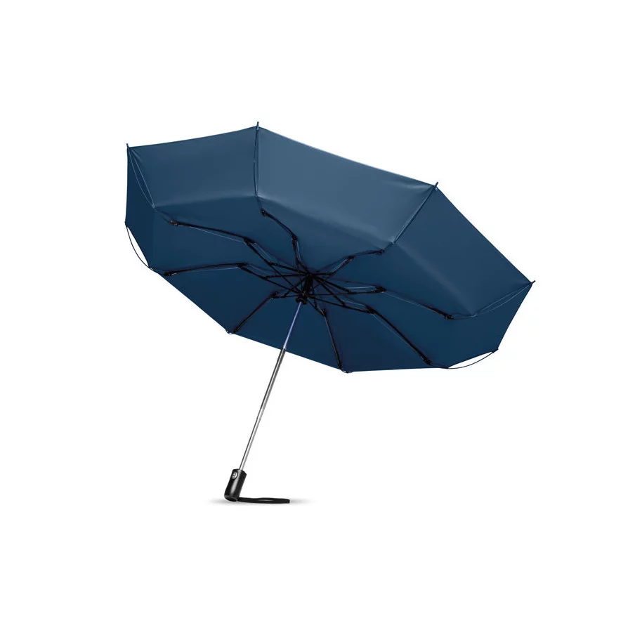 Le parapluie publicitaire à ouverture réversible est présenté dans sa version pliante. Il dispose d'une ouverture et d'une fermeture automatique. Son mât est fabriqué en acier chromé et les baleines sont en fibre de verre. Le parapluie fait 23''.