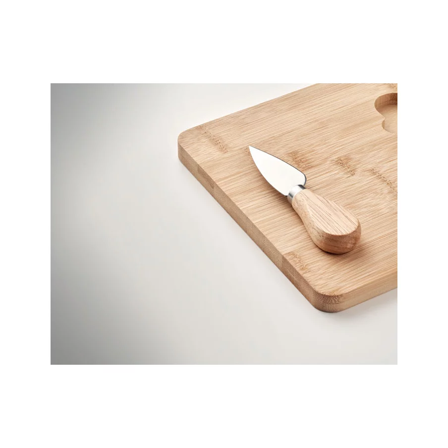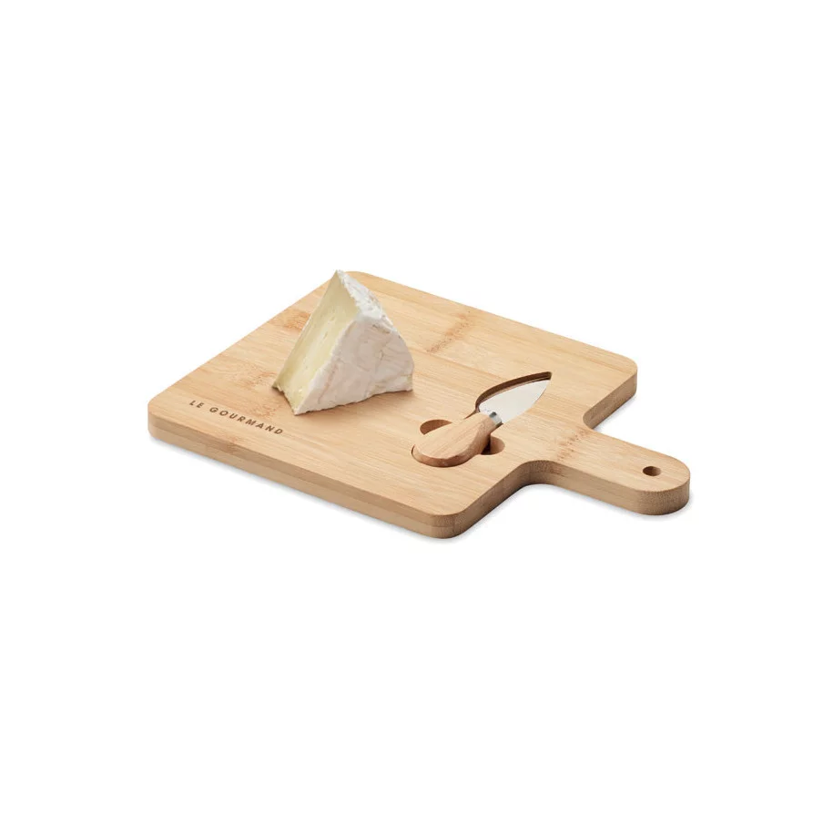 Le set à fromage Darfield personnalisé est fabriqué en bambou. Elle comprend une planche et un couteau.