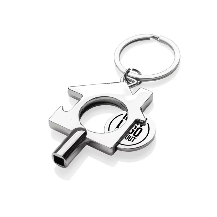 Ce porte-clés 3-en-1 en alliage de zinc recyclé RCS (80 % de contenu recyclé) intègre une clé de radiateur, un jeton de caddie et un décapsuleur. Livré dans un sachet en papier.
