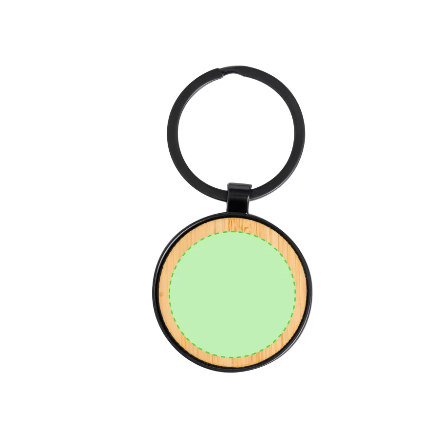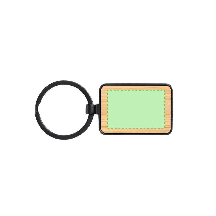 Ce porte-clés, à l'esthétique soignée, est composé de métal noir lisse et dispose d'une surface en bambou agréable au toucher. Il peut être personnalisé par gravure laser et est proposé en format rectangulaire ou circulaire, présenté dans une pochette en papier recyclé individuelle.