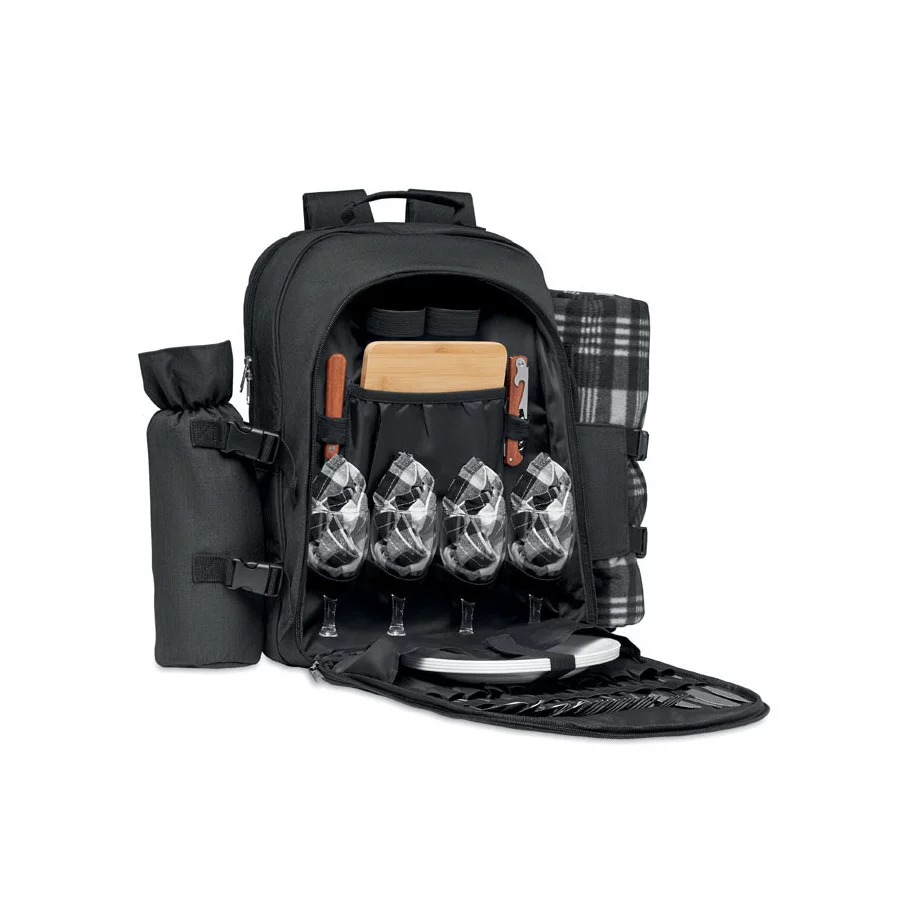 Le sac à dos pour pique-nique Duin est personnalisable à votre image. Il comprend tout le nécessaire pour 4 personnes avec compartiment de base réfrigérant, couverts, 1 limonadier, planche à découper, couteau à pain et couverture. Le sac est en polyester 300D RPET.