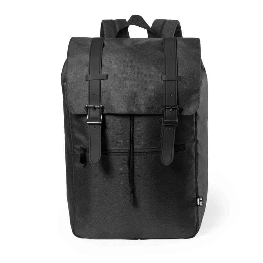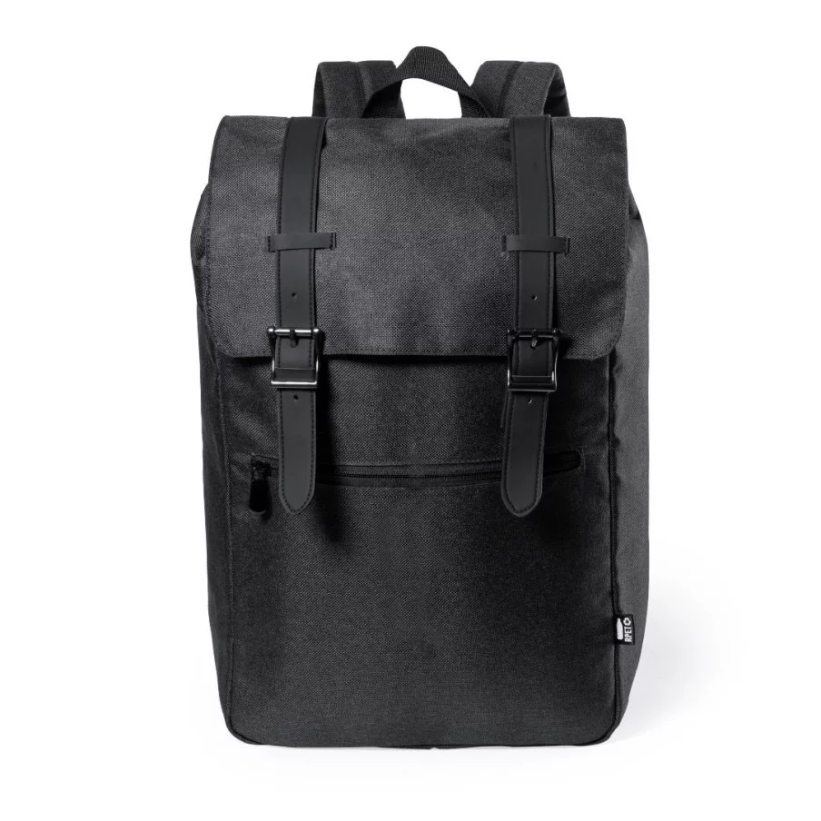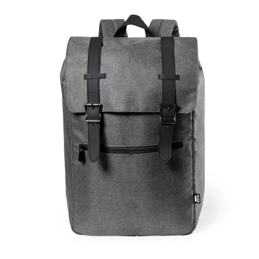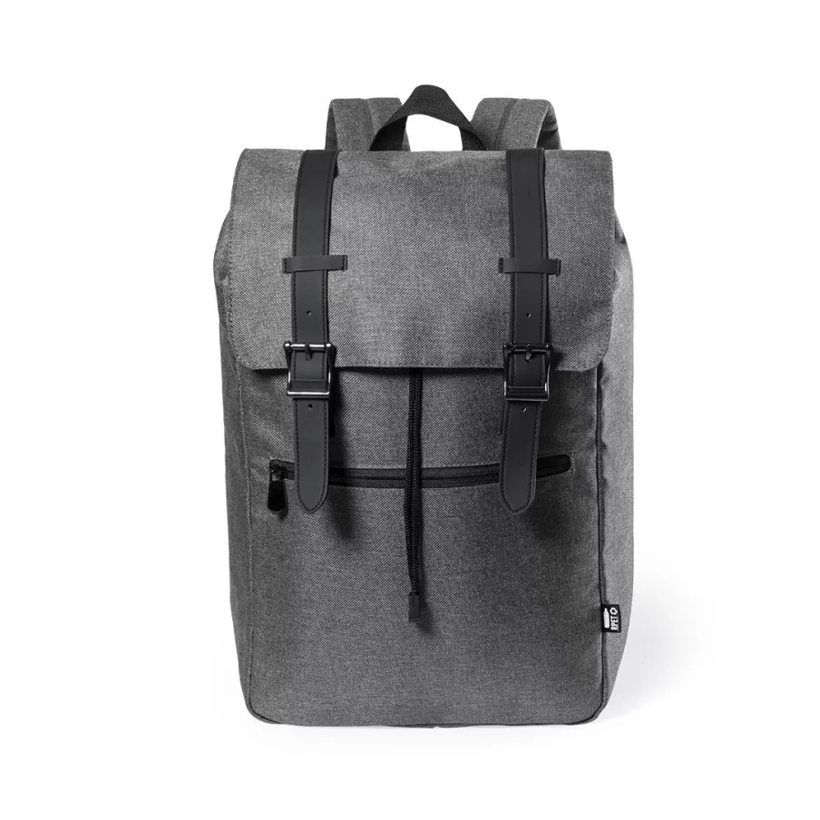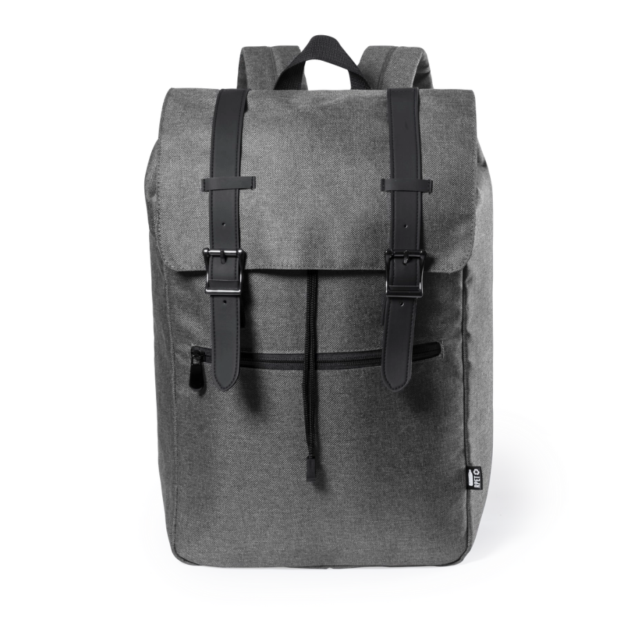 Le sac à dos personnalisé Budley est fabriqué en Rpet, c'est à dire à partir de plastique récyclé. Sa poche principale ferme avec des sangles et des boucles en métal. Il a également une poche frontale zippée et une tirette en métal. L'intérieur a une poche rembourrée pour un ordinateur portable jusquà 15 pouces et une tablette jusquà 10 pouces.