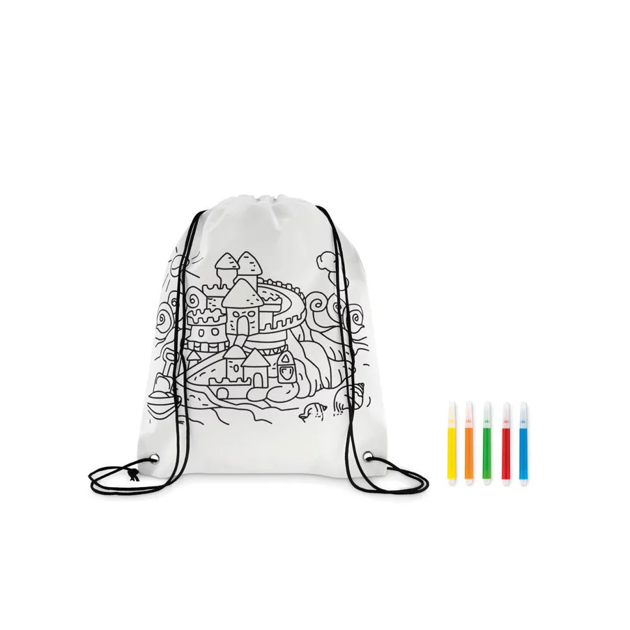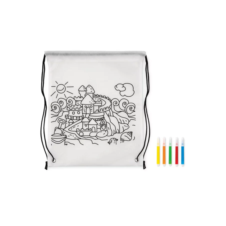 Le sac à cordon Carrydraw est conçu en polypropylène non tissé de 80 g/m², léger et résistant. Sa particularité : une face pré-imprimée avec des motifs à colorier. Il est livré avec un set de 5 feutres de couleur, permettant aux enfants (ou aux plus grands) de le personnaliser à leur goût. Son format à cordon en fait un sac pratique à porter au dos ou à l’épaule.