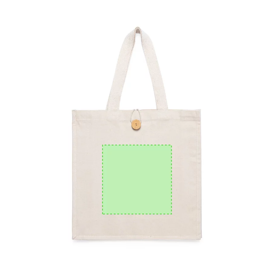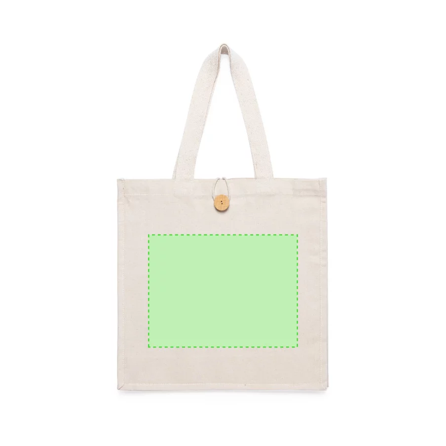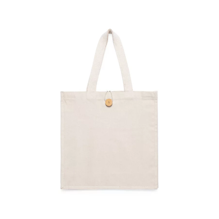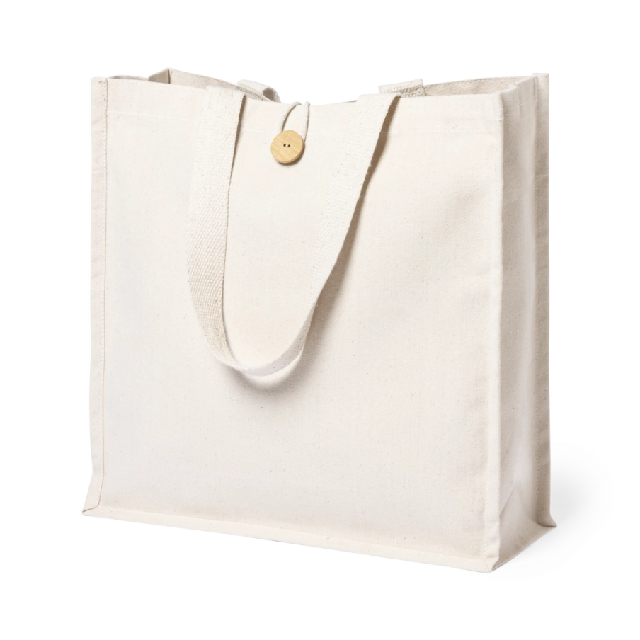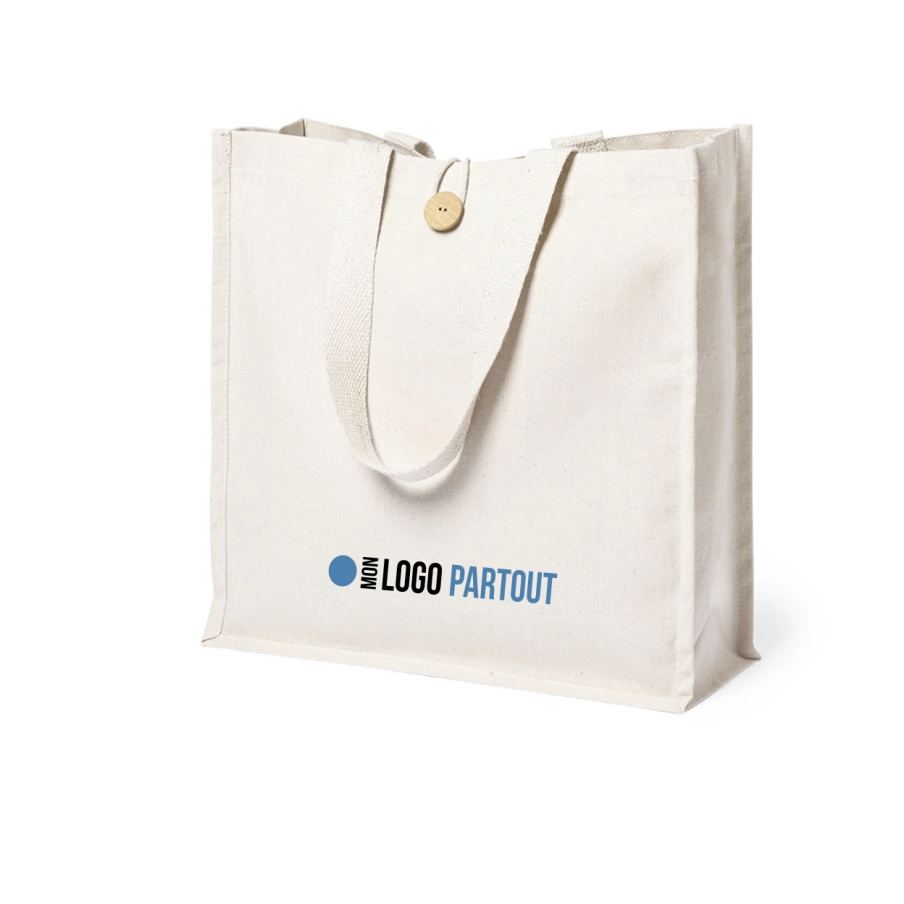 Sac promotionnel 100% coton ultra résistant. Qualitatif avec une finition naturelle, ce sac publicitaire est un incontournable. Avec sa fermeture boutonnée d'origine et sa finition cousue et à soufflet, c'est le cadeau idéal pour vos clients.