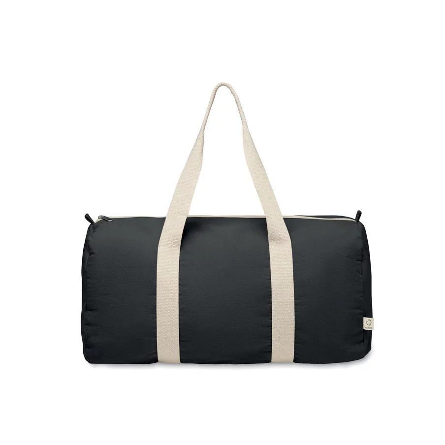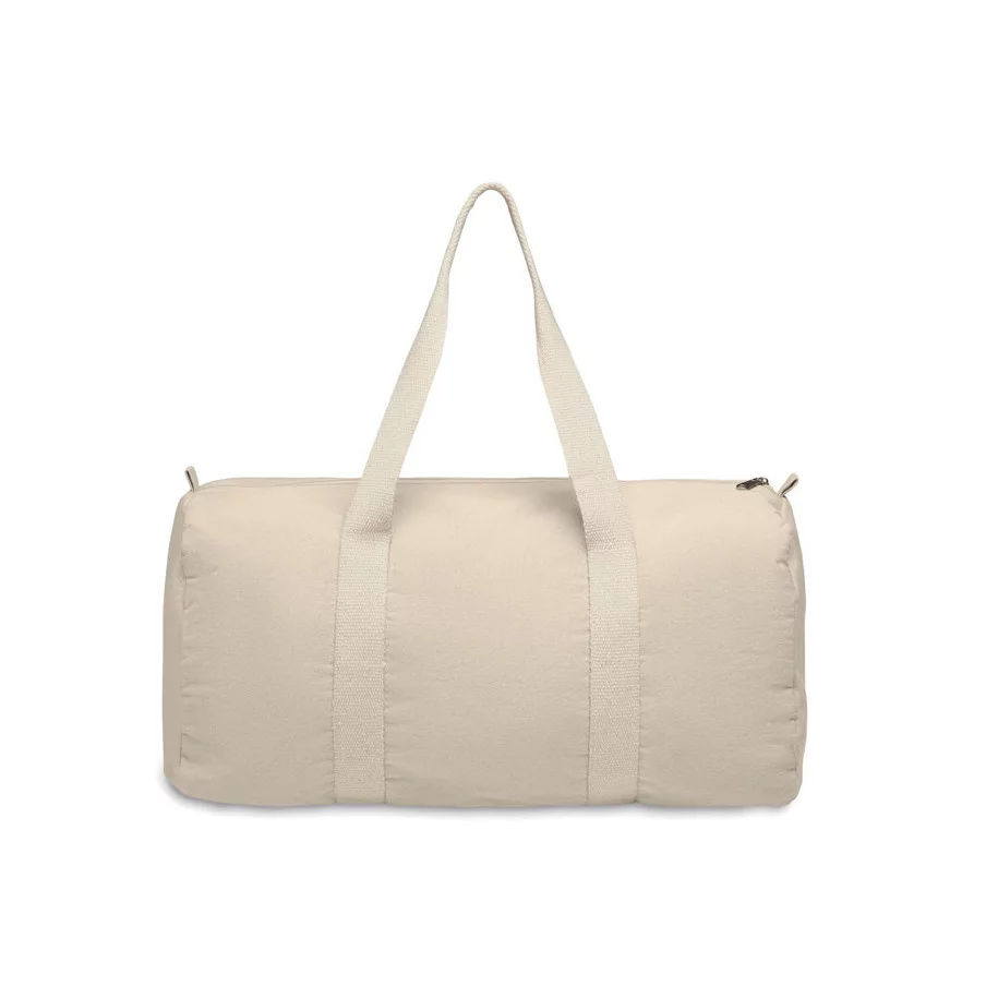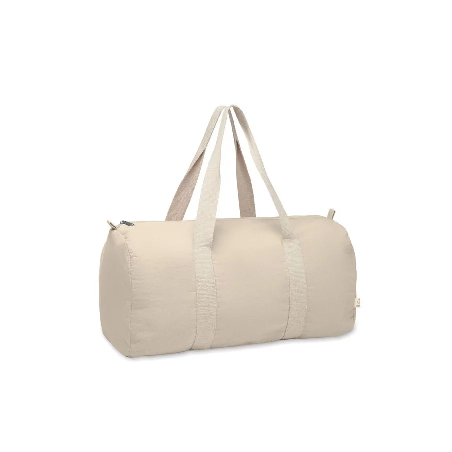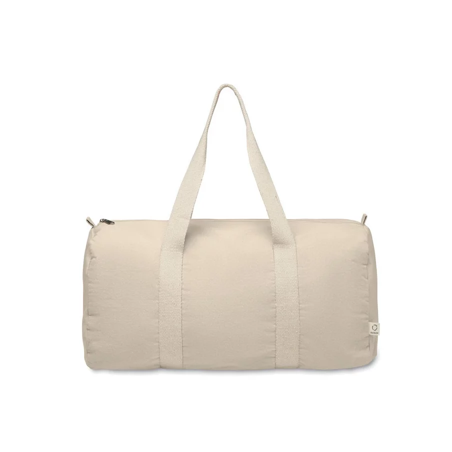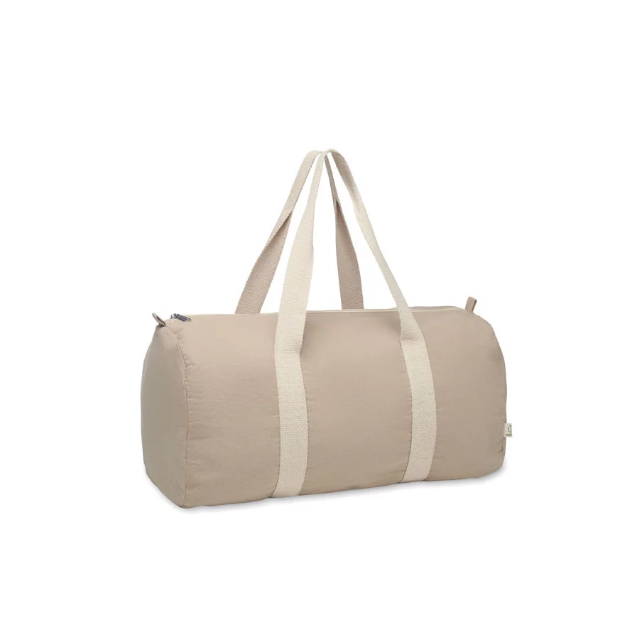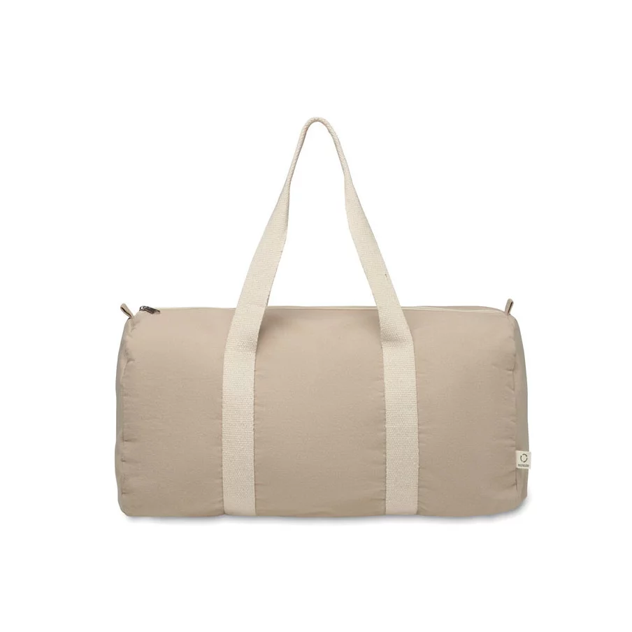 Ce sac polochon est fabriqué en coton recyclé (80 %) et polyester recyclé (20 %). Il est idéal pour le sport ou les voyages, avec compartiment latéral et poche intérieure zippés.