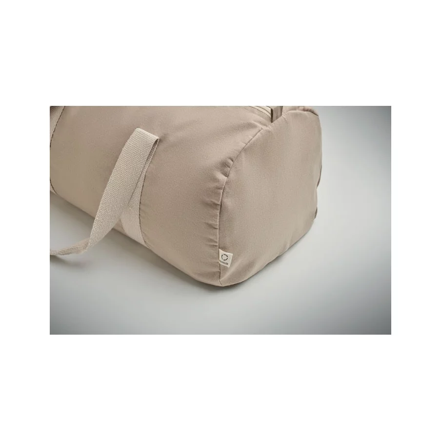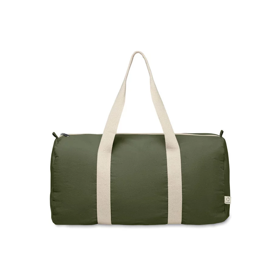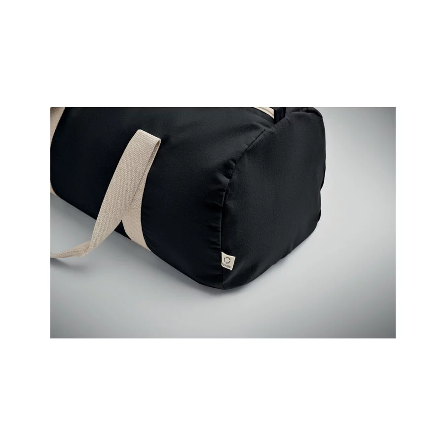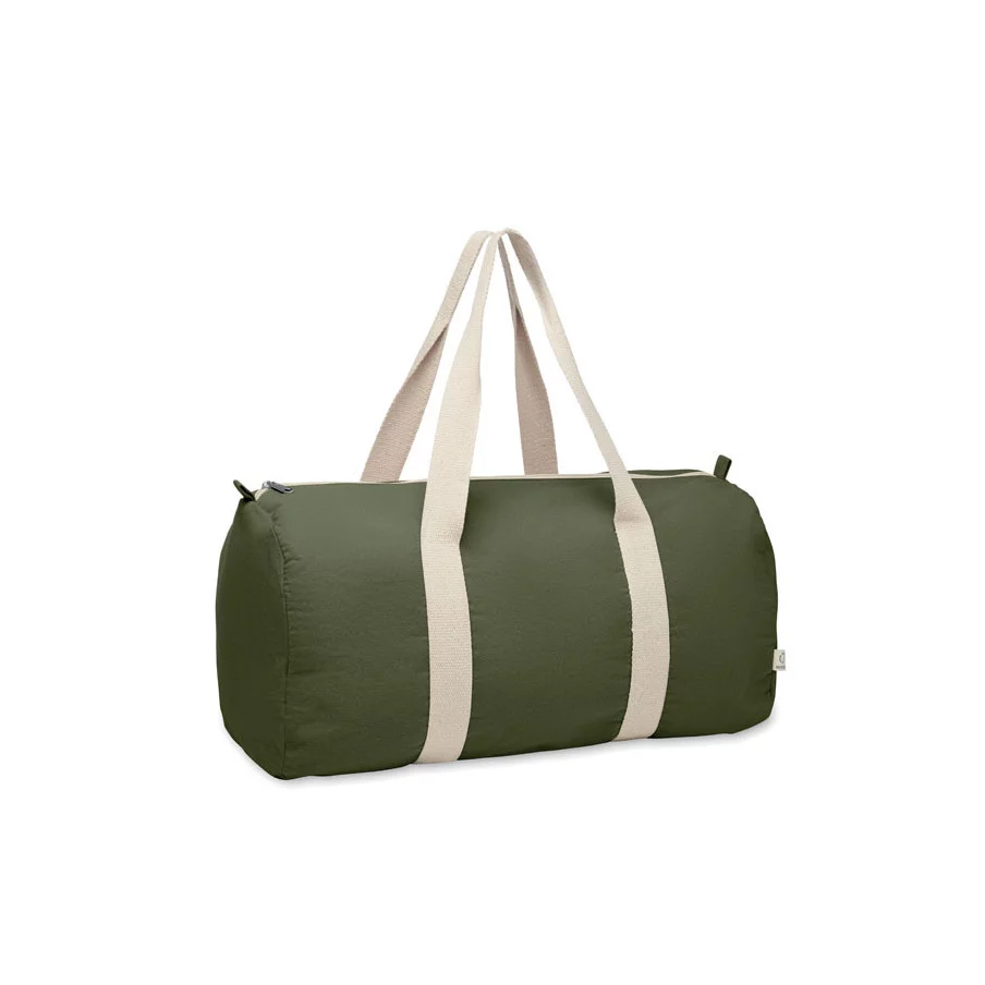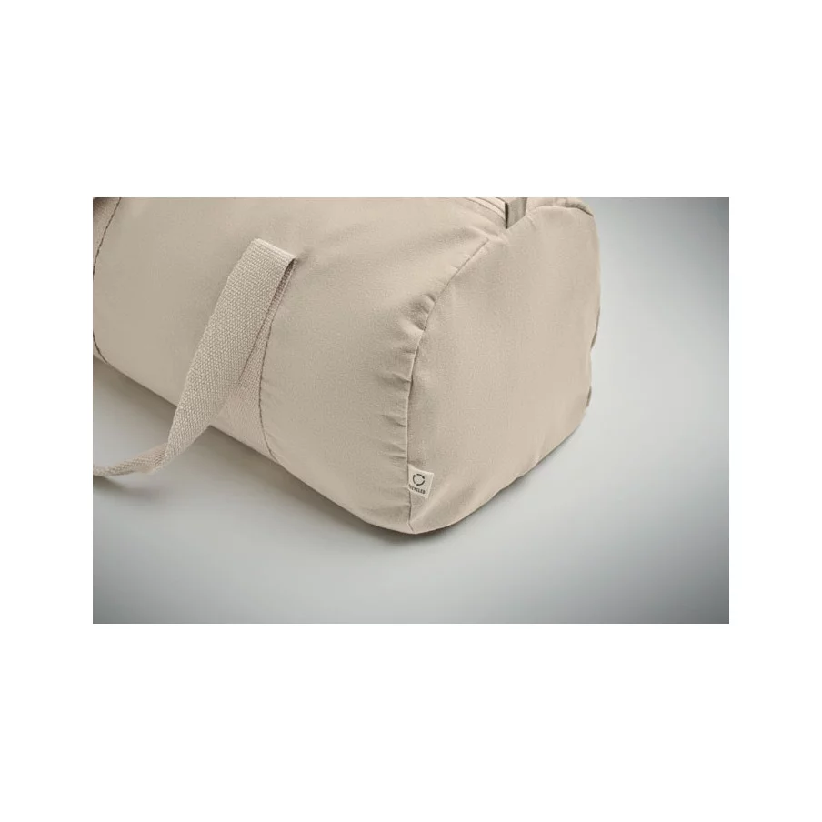 Ce sac polochon est fabriqué en coton recyclé (80 %) et polyester recyclé (20 %). Il est idéal pour le sport ou les voyages, avec compartiment latéral et poche intérieure zippés.