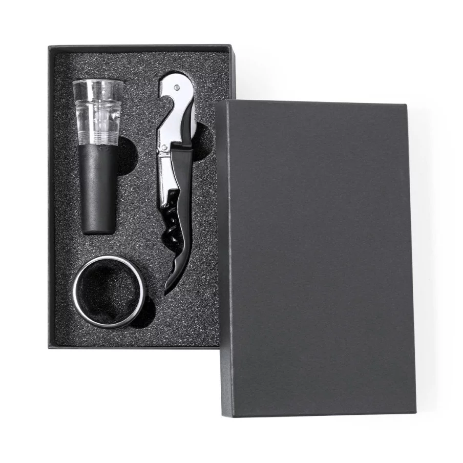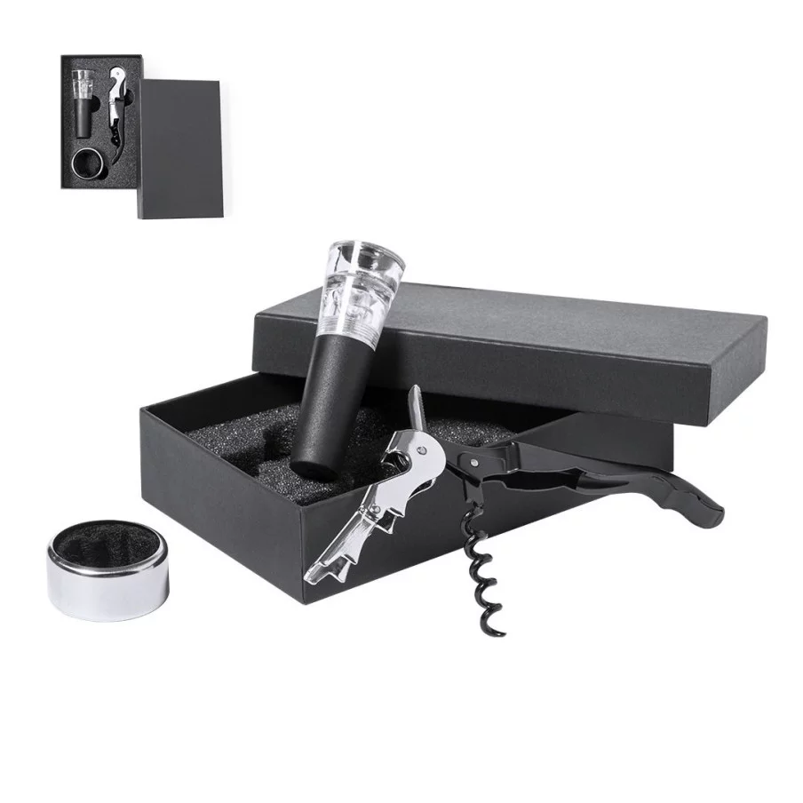 Le set à vin personnalisable Noarek est très complet. Il inclut un bouchon anti-goutte, un tire-bouchon en acier inoxydable et un bouchon de pompe à vide. Tous ces accessoires sont en finition noire élégante.