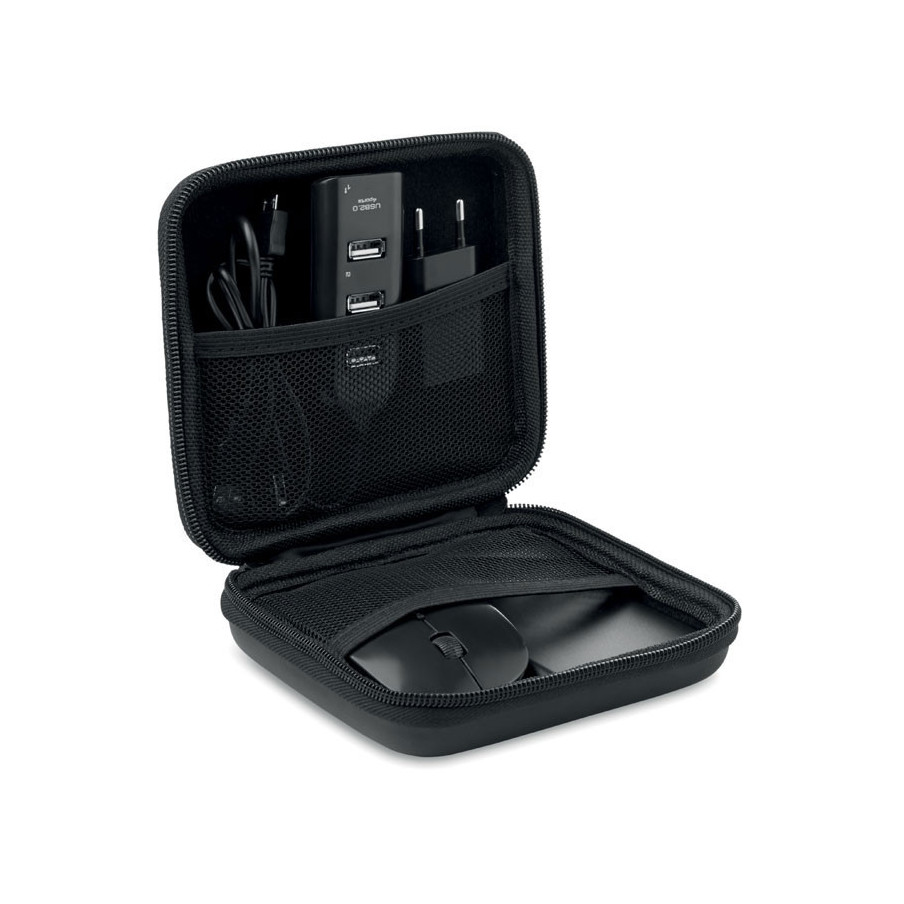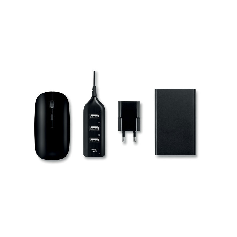 Personnalisez à vos couleurs notre set d'accessoires informatiques. Présenté dans une pochette qui comprend: 1 souris sans fil, 1 hub 4 ports USB 2.0 , 1 prise EU et un powerbank 4000 mAh. Câble de chargement micro USB inclus.