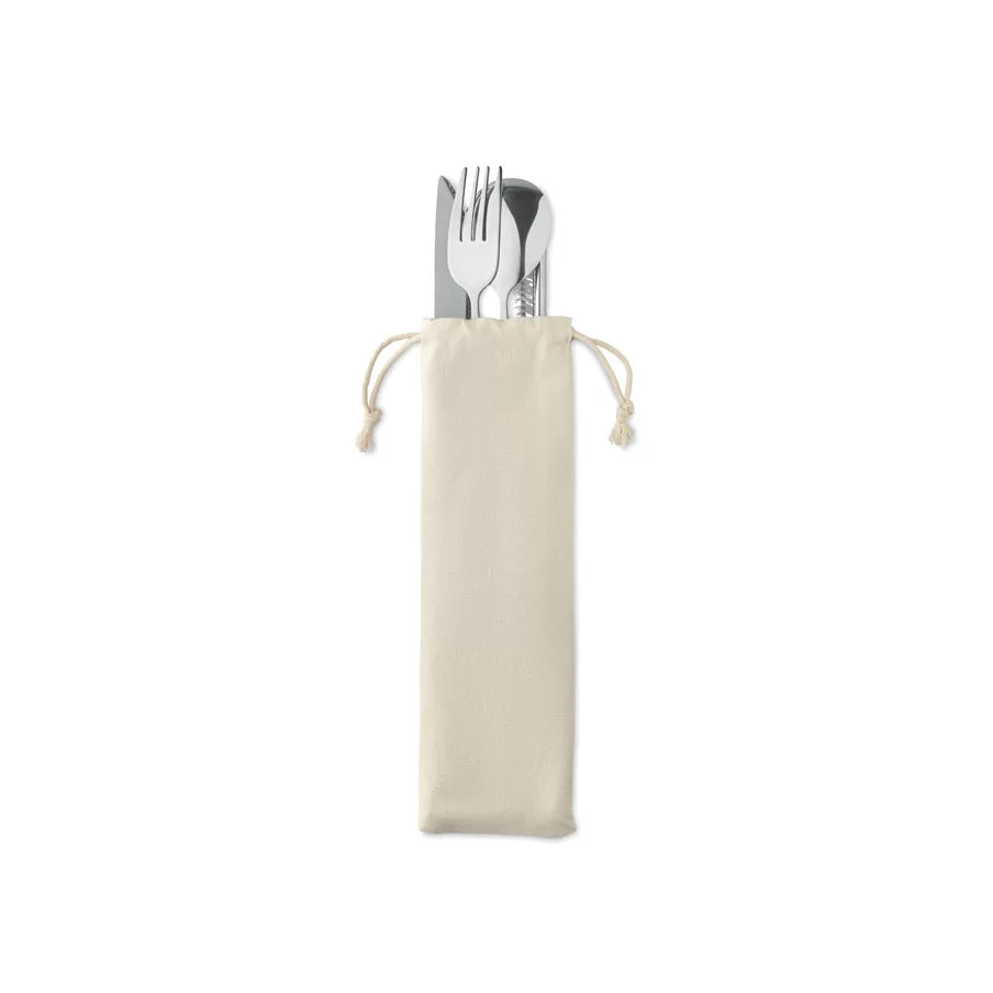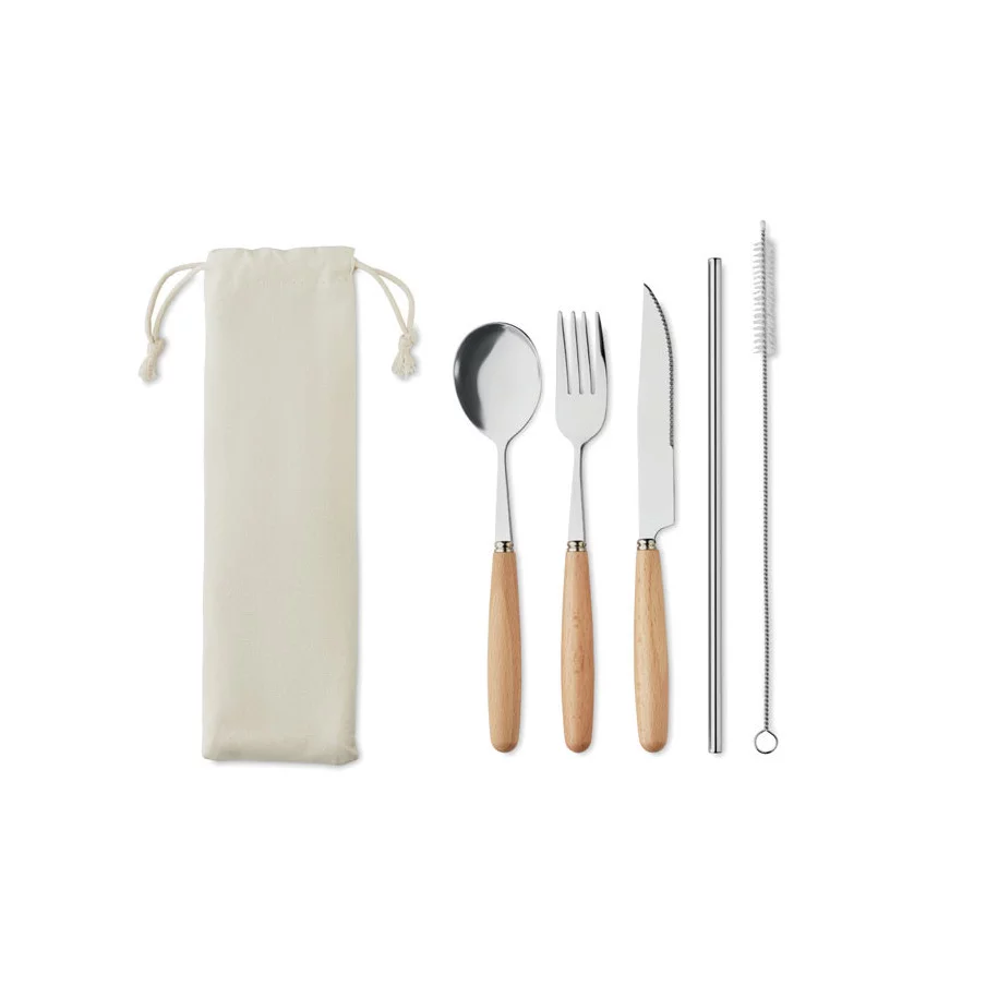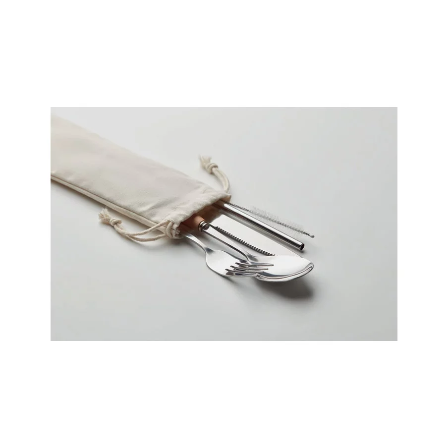 Ce set incroyable comprend un couteau, une fourchette, une cuillère, une paille en acier inoxydable et une brossette de nettoyage. Le tout livré dans une sublime pochette en coton.