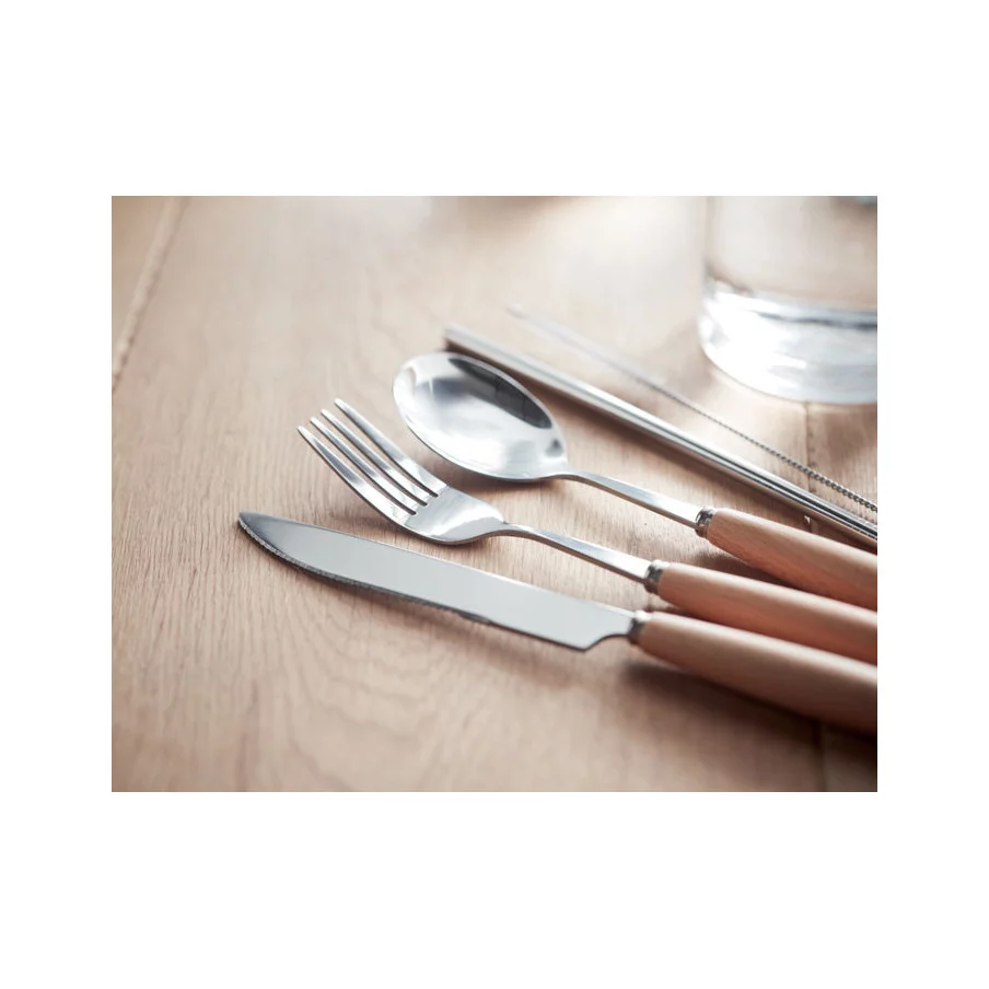 Craquez pour notre set de couverts en acier inoxydable et manche en bois de hêtre, personnalisable à vos couleurs.Livré dans une pochette en toile personnalisable avec votre logo.