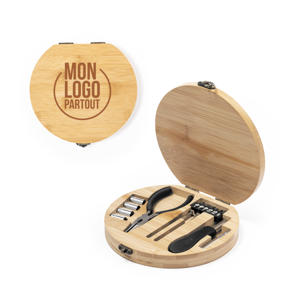 Craquez pour notre set de bricolage publicitaire, composé de 15 accessoires pratique pour un dépannage rapide. Personnalisez la boîte en bambou aux couleurs de votre entreprise.