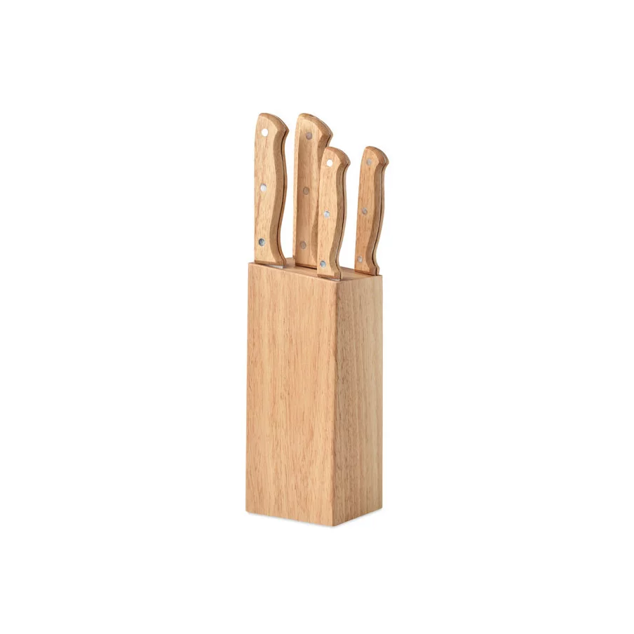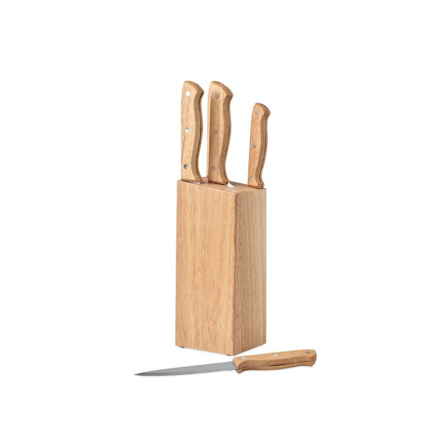 Véritable cadeau publicitaire, ce produit s'insérera très facilement dans les cuisines de vos clients et collaborateurs, avec son apparence bois du plus bel effet. Produit de cuisine promotionnel qualitatif, cet ensemble de couteaux comprend cinq éléments : Un couteau de chef, un couteau à pain, un couteau à trancher un multifonctions et un d'office. S'intégrant parfaitement dans leurs supports en bois, ces couteaux promotionnels peuvent également être personnalisés tout comme le socle en bois.