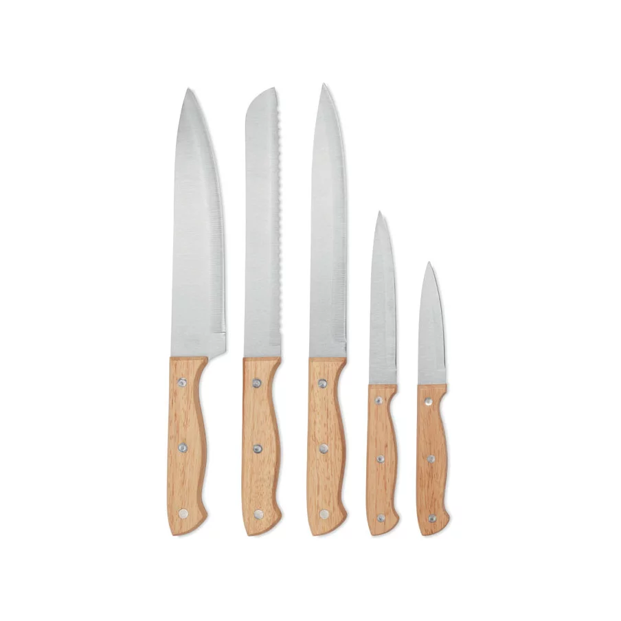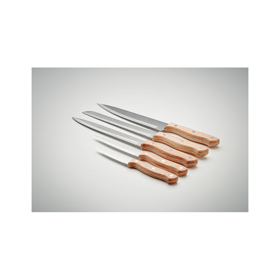 Un ensemble en bois comprenant 5 couteaux : Chef, à pain, à trancher, multifonctions et d'office. Très beau cadeau d'affaire à offrir à vos clients.