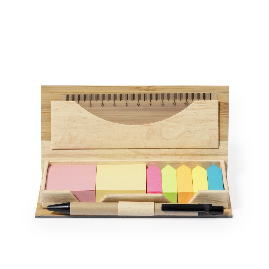 Ce coffret de bureau fabriqué en bambou comprend un étui avec des notes adhésives de différentes tailles et couleurs, une règle et un stylo en carton recyclé.