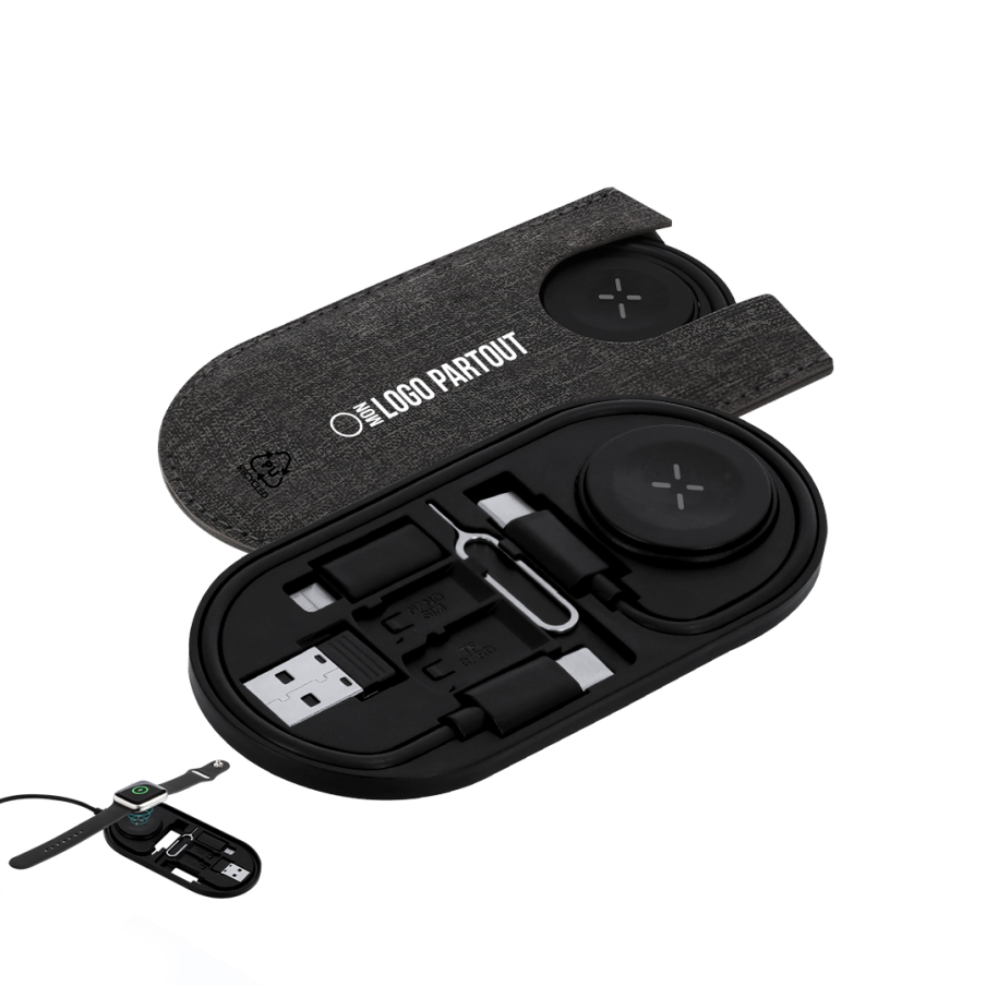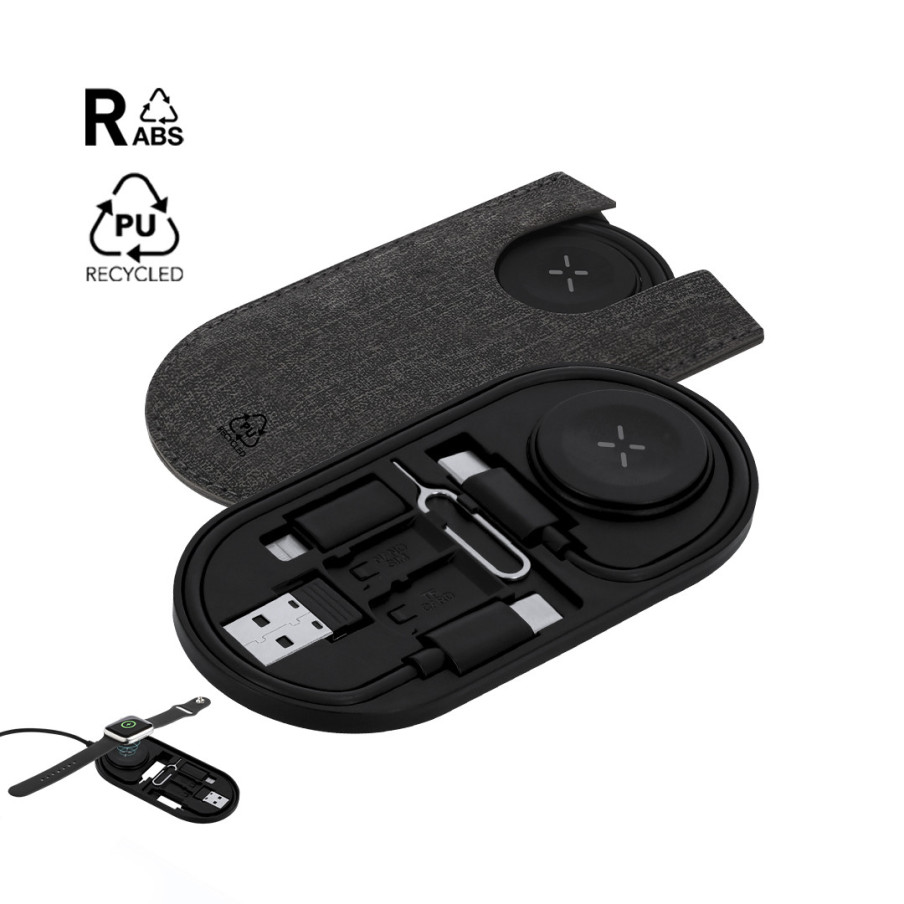 Le set de câbles Nebrex, en ABS recyclé, inclut charge sans fil pour smartwatch, câble multifonction (USB, Type-C, Lightning) et pin éjecteur de SIM.