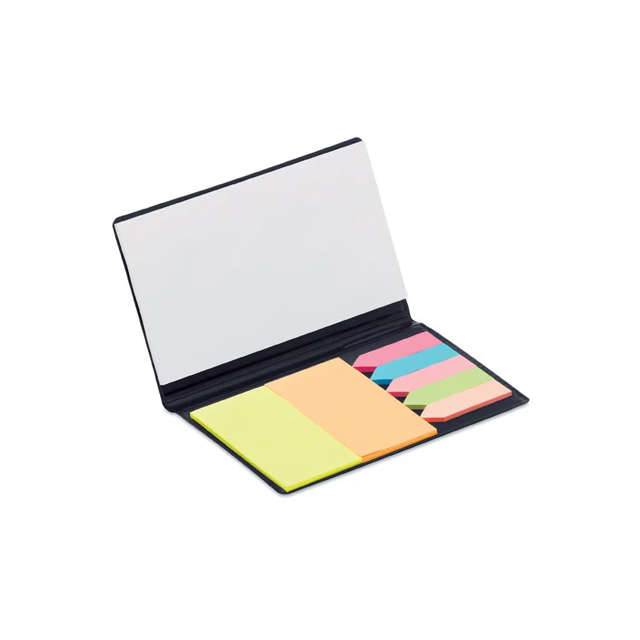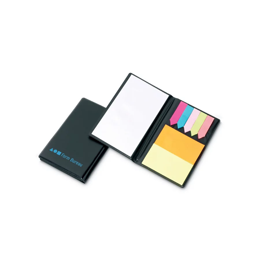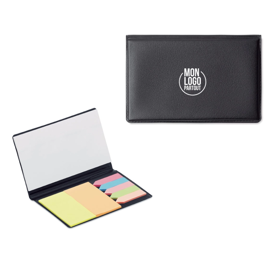 Personnalisez avec votre logo d'entreprise, notre set de mémos pratique incluant 1 grand bloc, 2 blocs rectangulaires colorés et 5 petits blocs colorés.